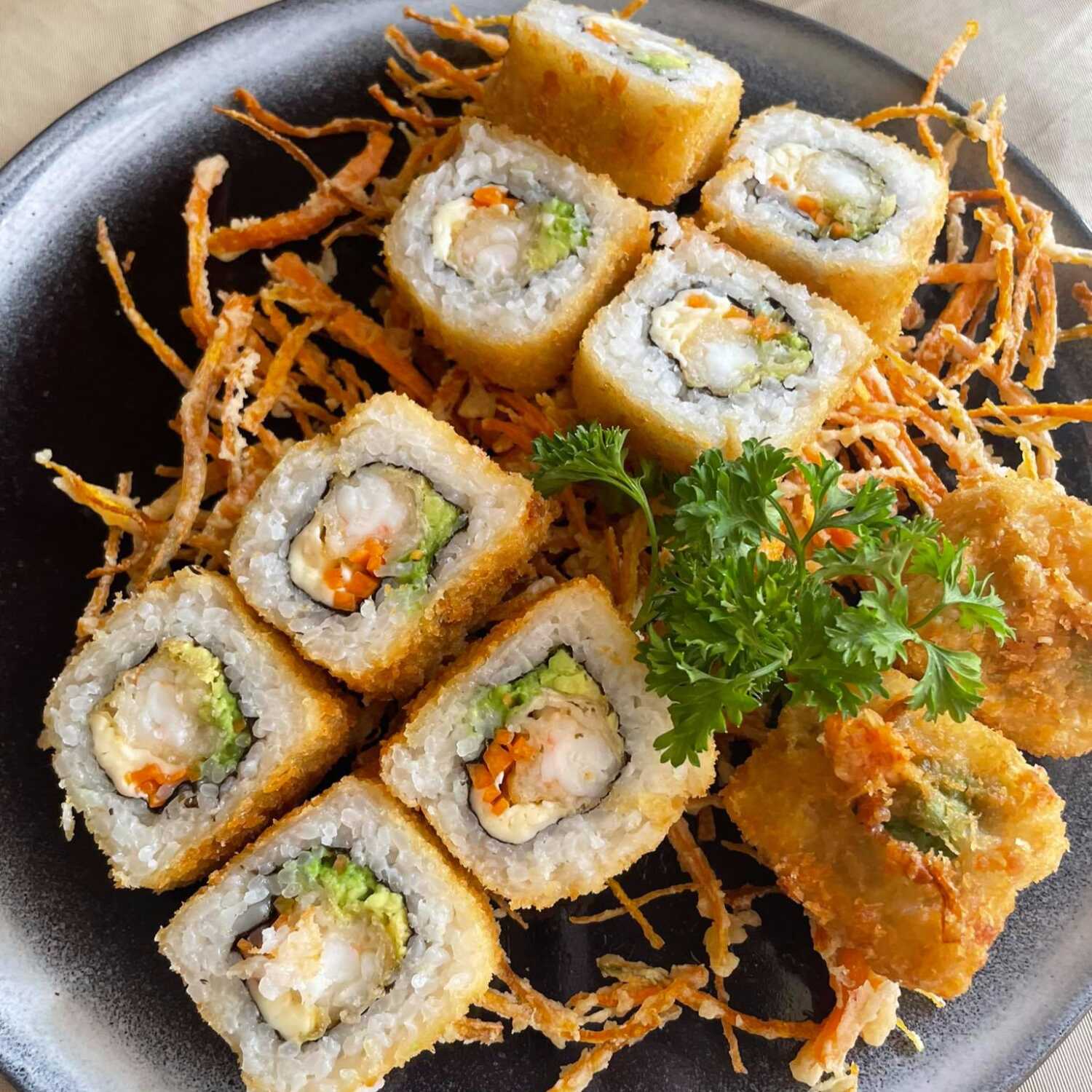 Roll empanizado montado sobre cama de kakiague, relleno de zanahoria, queso manchego, aguacate y camarón capeado, acompañado de salsa dulce