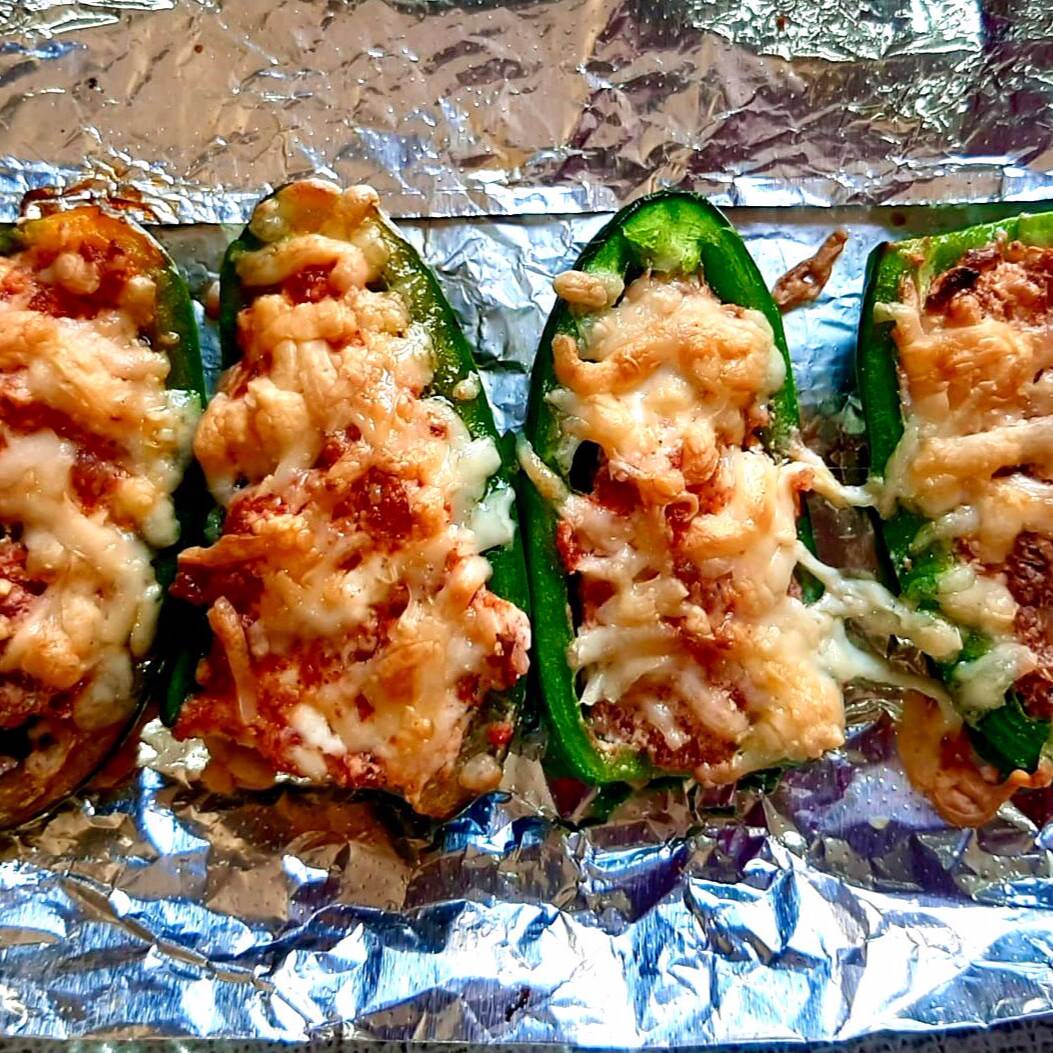 Dos jalapeños a la mitad (4 mitades) rellenos de queso crema, chorizo, tocino y queso manchego, cocinados al horno y servidos con crema