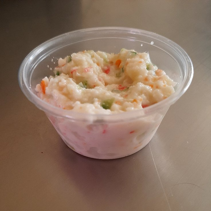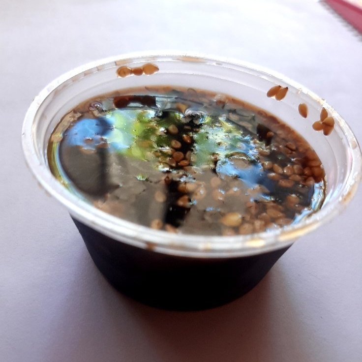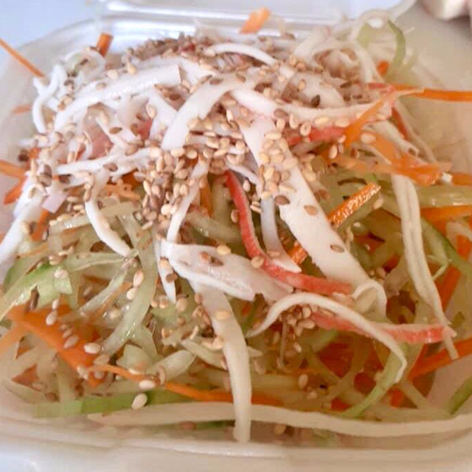 Suma de pepino, surimi, bañado en vinagre dulce, ajonjolí encima.