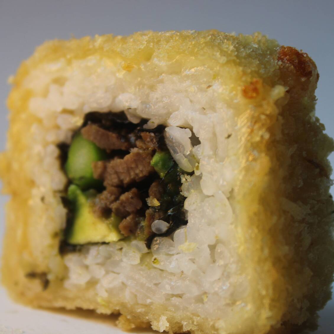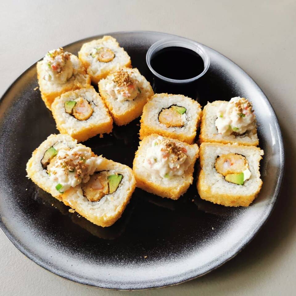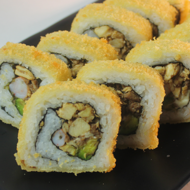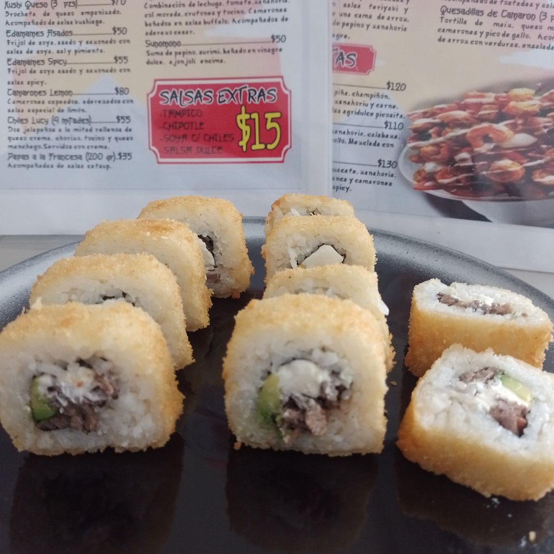 Roll empanizado relleno de queso crema, aguacate, camarón cocido, carne y pollo, acompañado de soya de limón y salsa chipotle