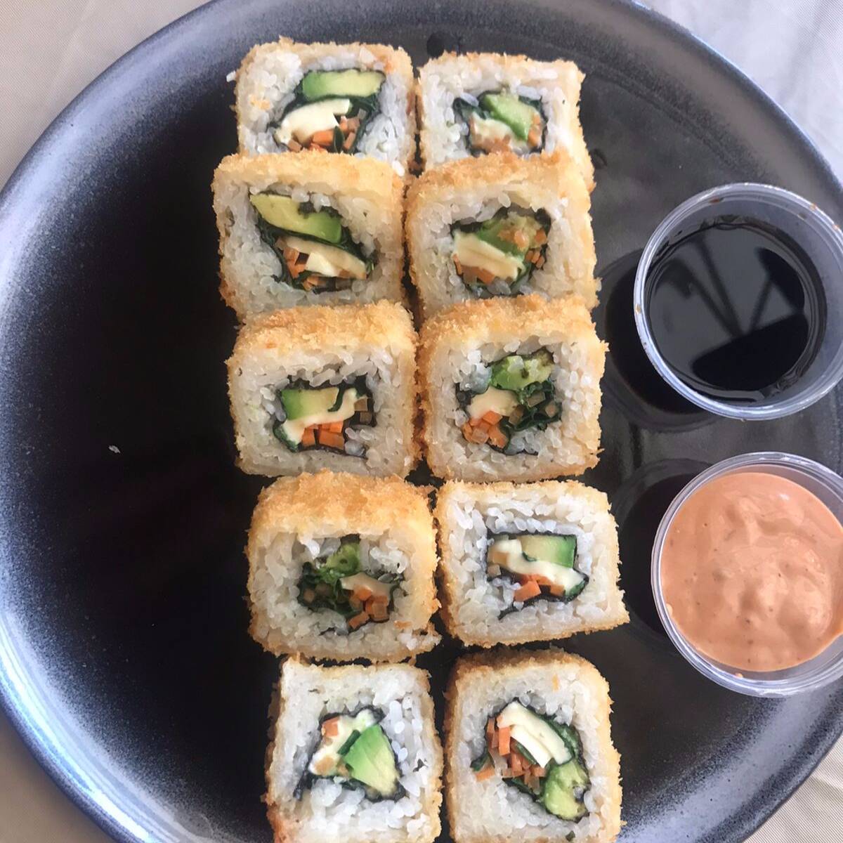 Roll empanizado relleno de espinaca, queso manchego, zanahoria y aguacate, acompañado de salsa chipotle y soya limón