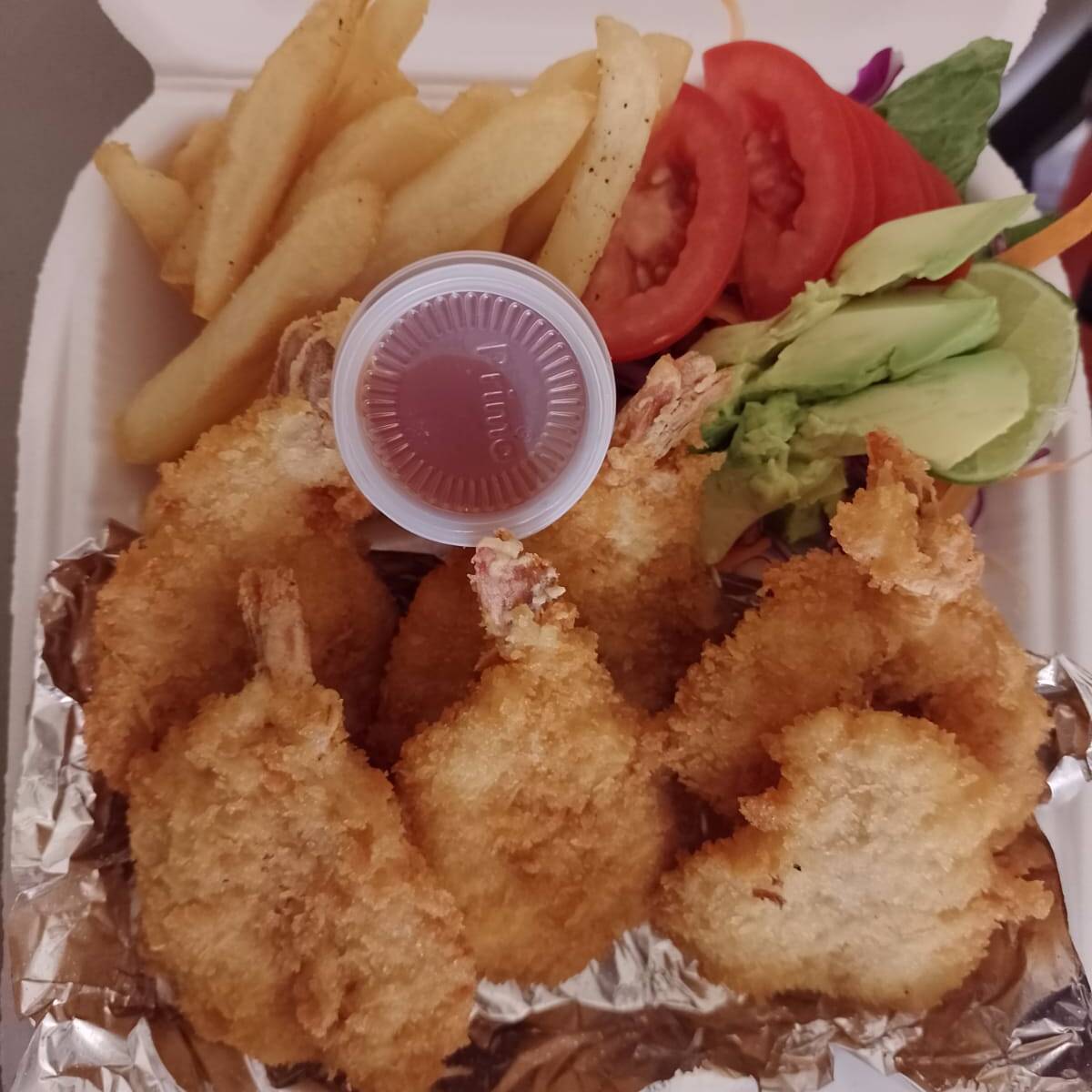 Camarones cubiertos con una capa de pan rallado, acompañados de papas a la francesa y ensalada
