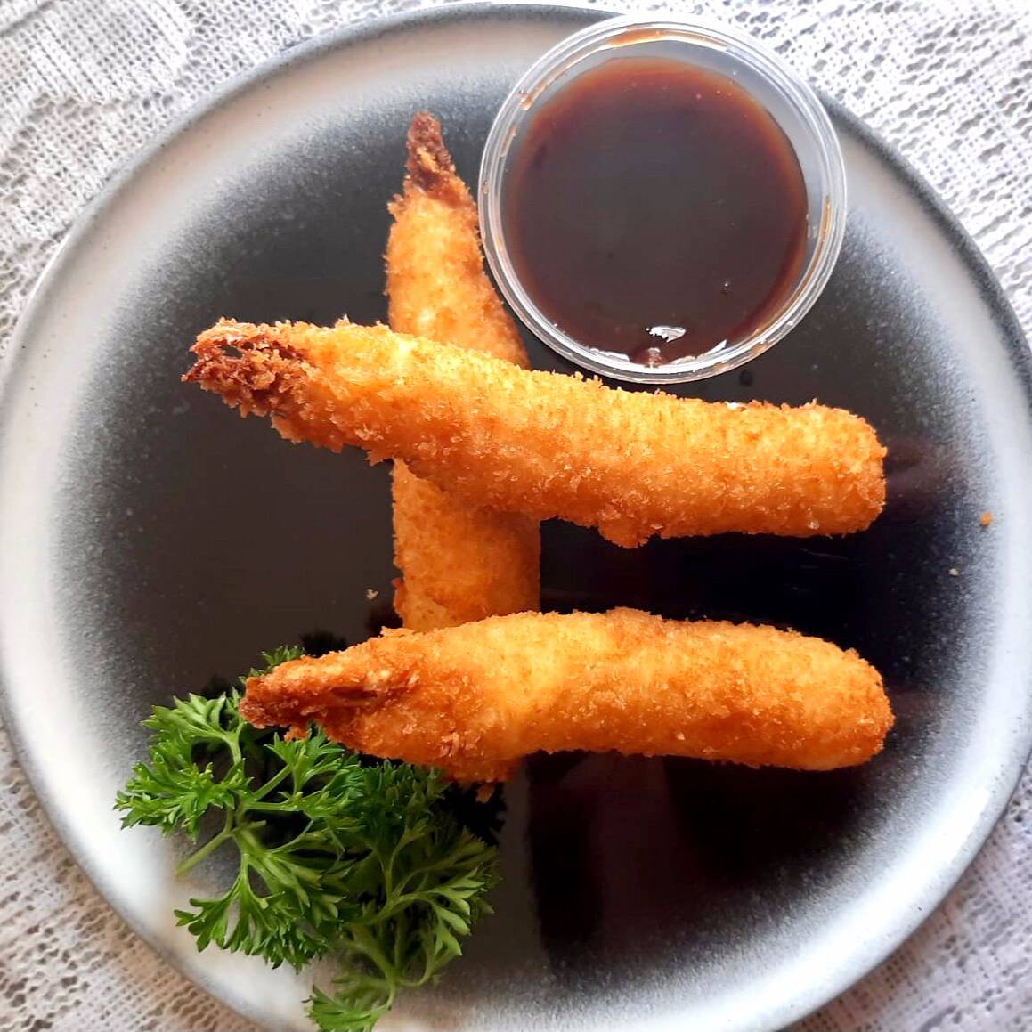 3 brochetas empanizadas de camarón relleno de queso crema, acompañadas de salsa Kushague
