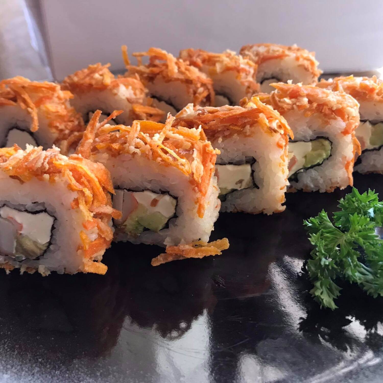 Arroz avinagrado, salsa tampico, surimi finamente picado, camarón cocido, cubos de queso crema y aguacate, bañados en salsa teriyaki