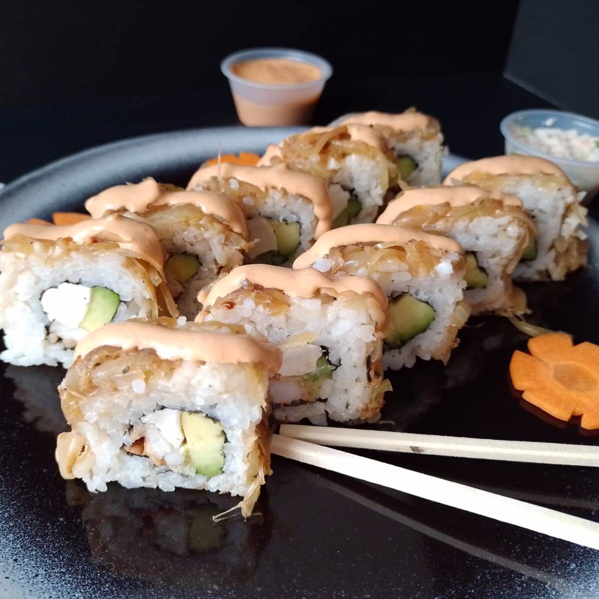 Roll cubierto de kakiague, relleno de aguacate, queso crema y surimi, acompañado de salsa dulce