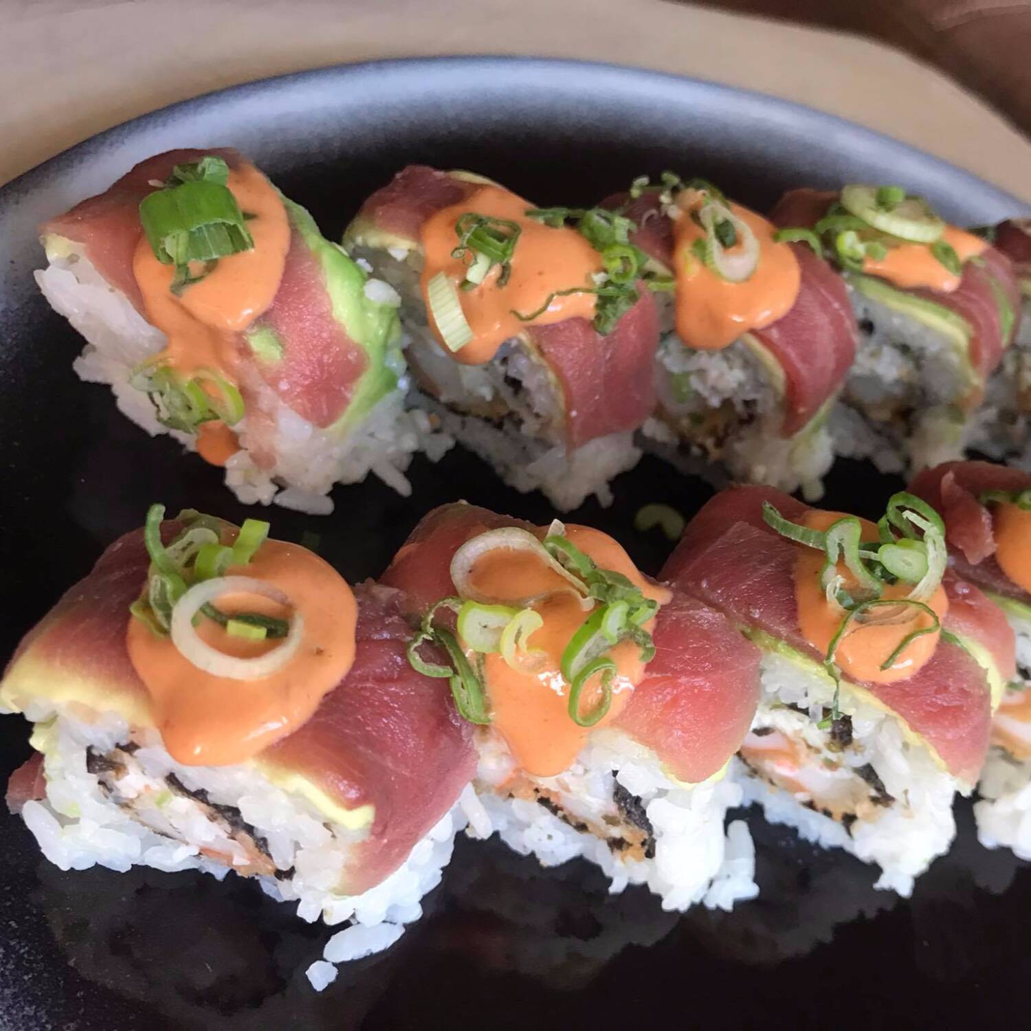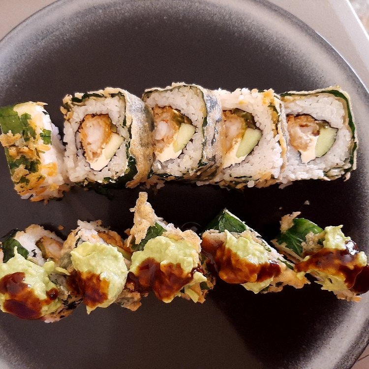 Roll capeado cubierto de algas sobre 10 piezas de camarones lemon con un toque de cebollín, relleno de atún spicy y aguacate, acompañado de salsa siracha
