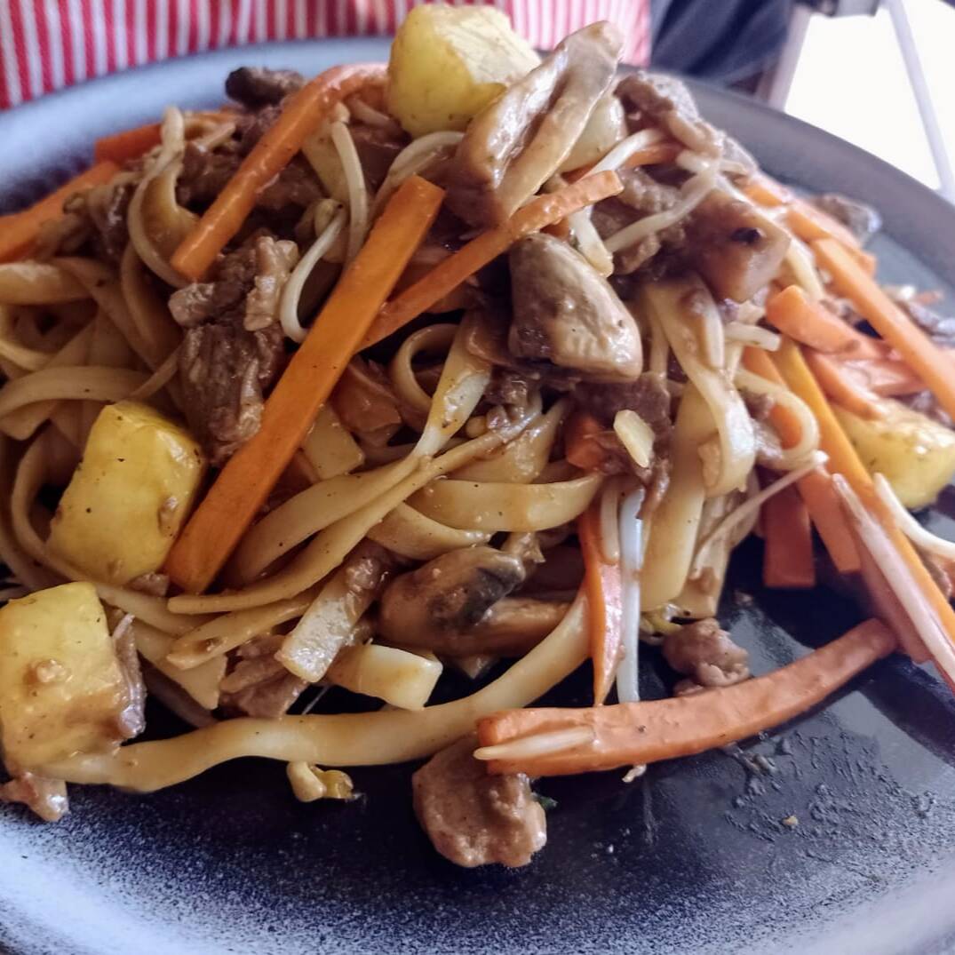 Pasta fetuccini con piña, champiñón, germen de soya, zanahoria y carne, mezclada con salsa agridulce picosita