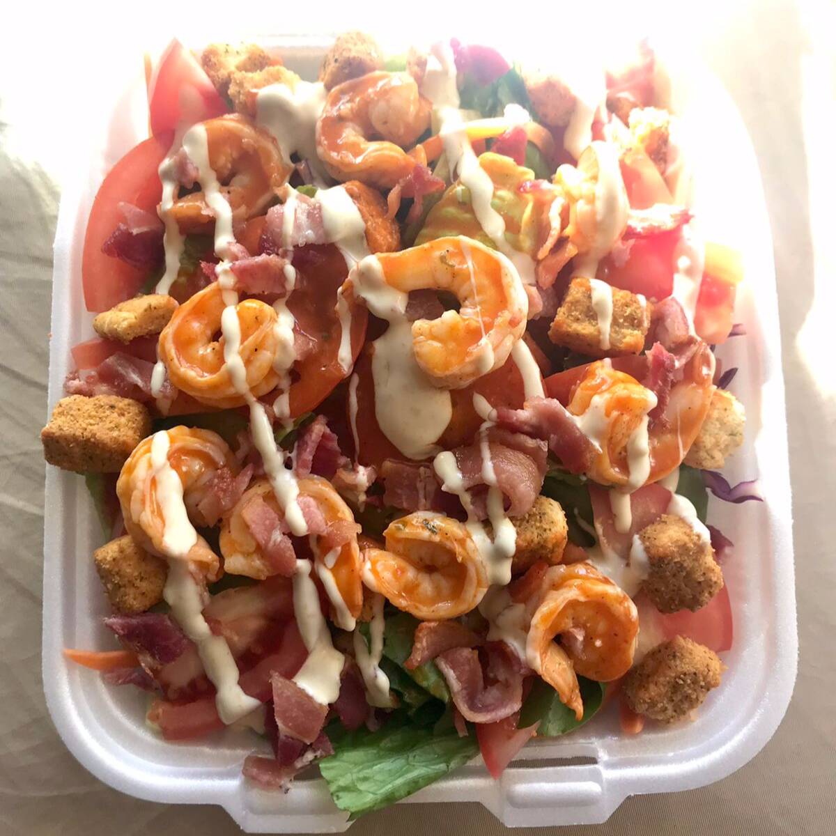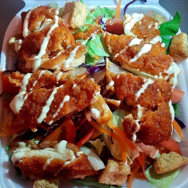 Combinación de lechuga, tomate, zanahoria, col morada, crutones y tocino, camarones bañados en salsa buffalo, acompañada de aderezo césar.
