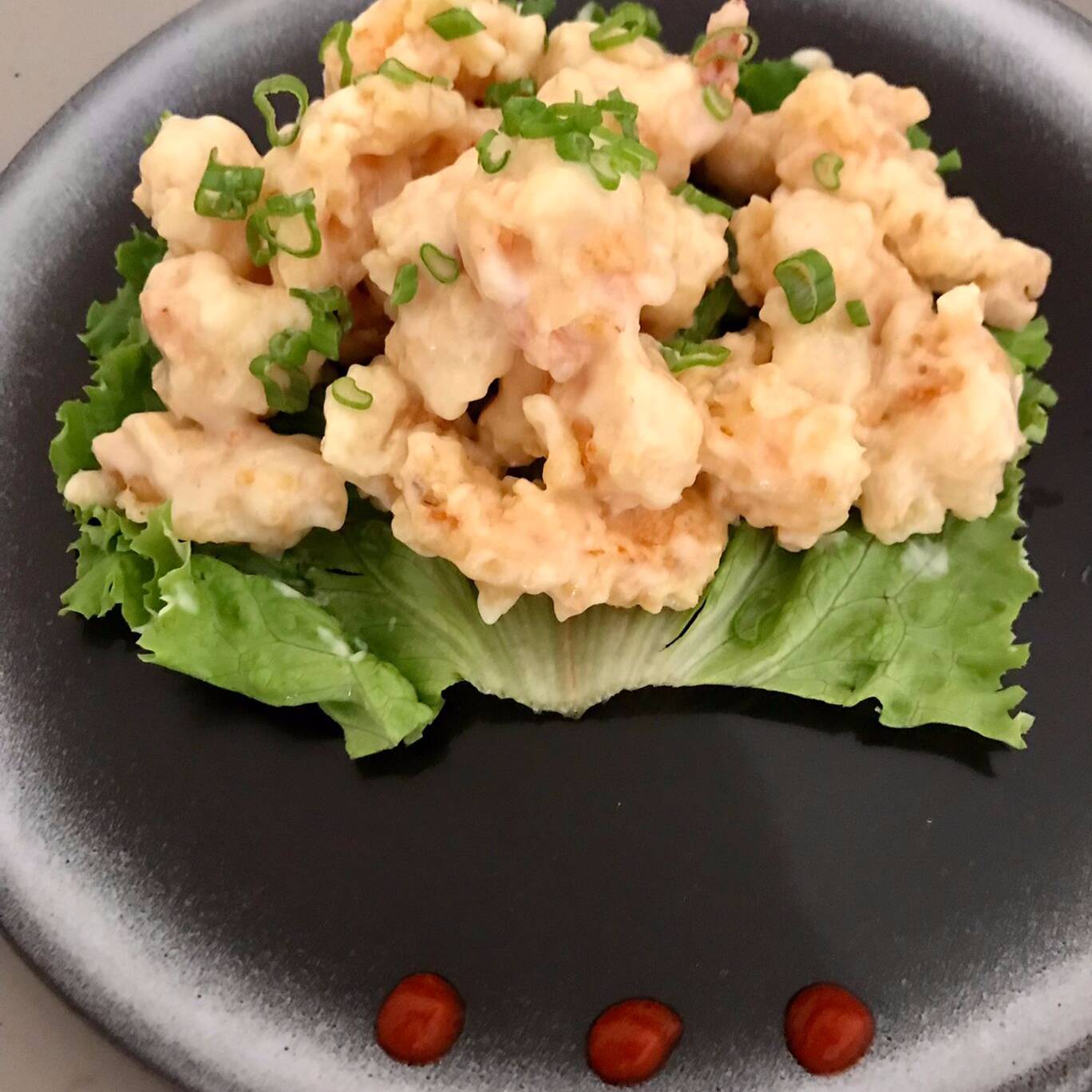 Camarones capeados, aderezados con salsa especial de limón, servido con un toque de cebollín y salsa siracha