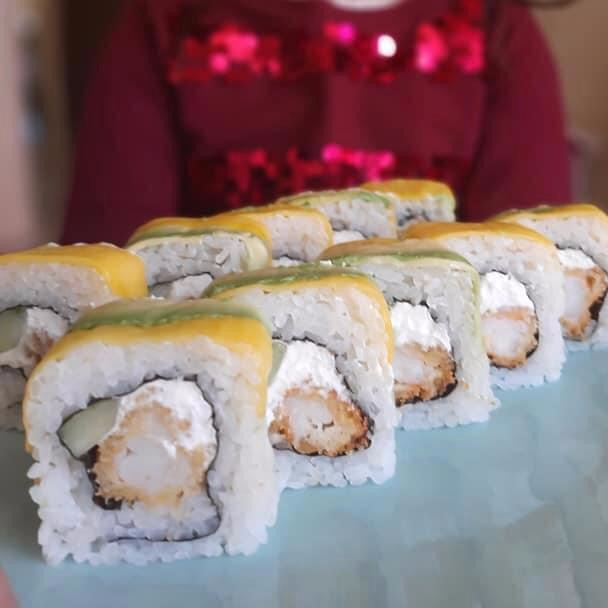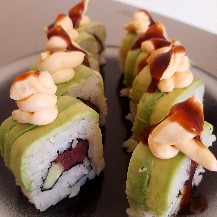 Roll cubierto de aguacate y mango, relleno de pepino y ebi cheese, acompañado de salsa dulce y chipotle