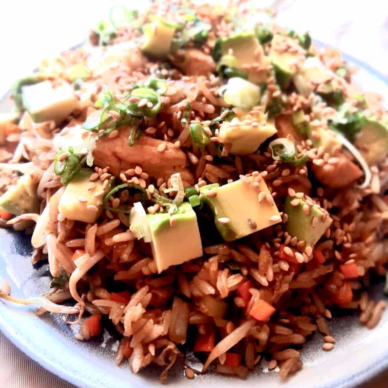 Arroz frito y verduras, germen de soya, cebollín, ajonjolí, la proteína de su elección, aguacate encima.