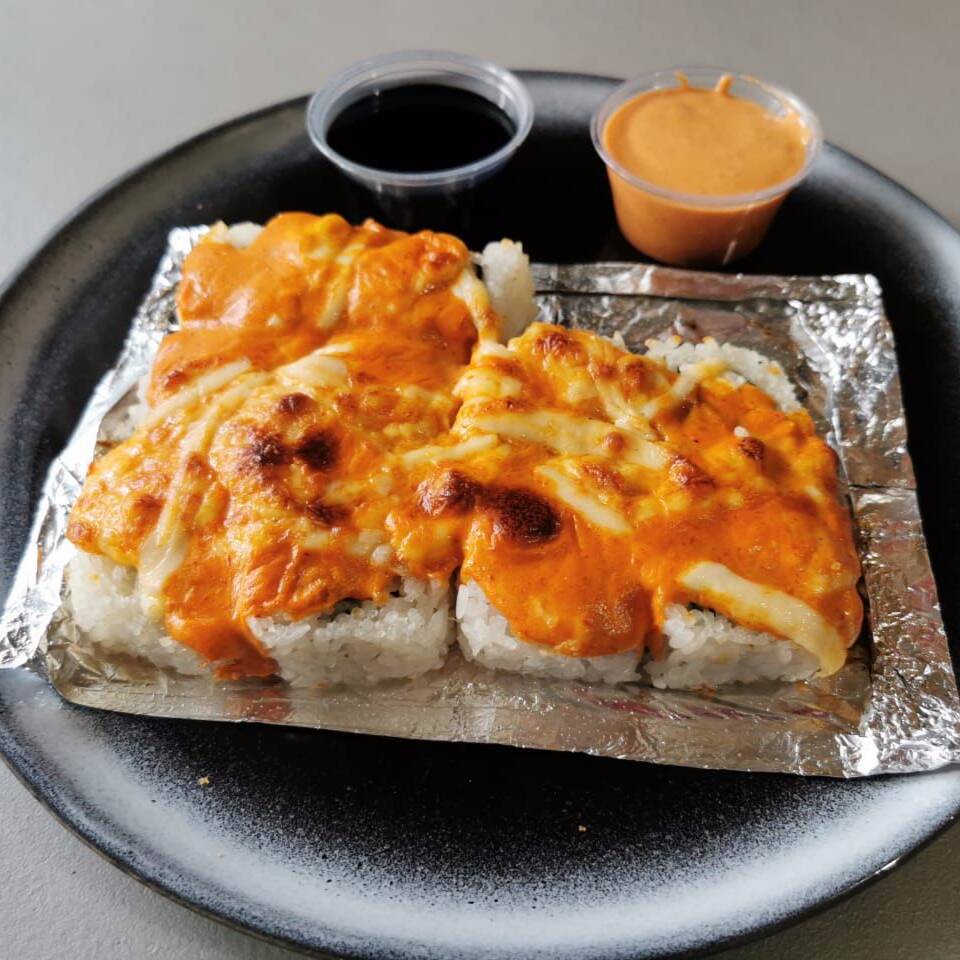 Roll cubierto de chipotle y queso manchego, relleno de queso, aguacate y salmón horneado, acompañado de salsa dulce