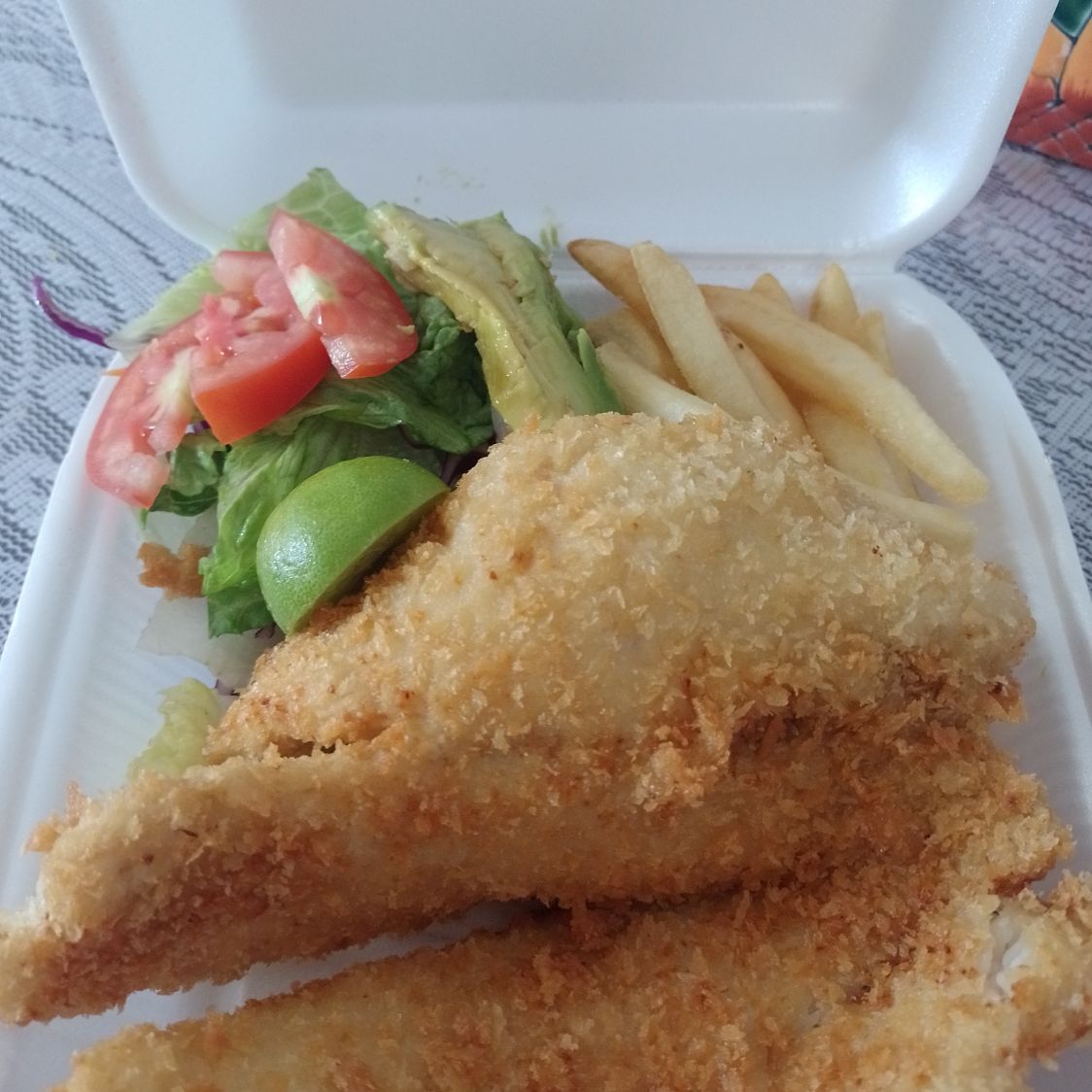 Trozos de pescado cubiertos con una capa de pan rallado, acompañados de papas a la francesa y ensalada