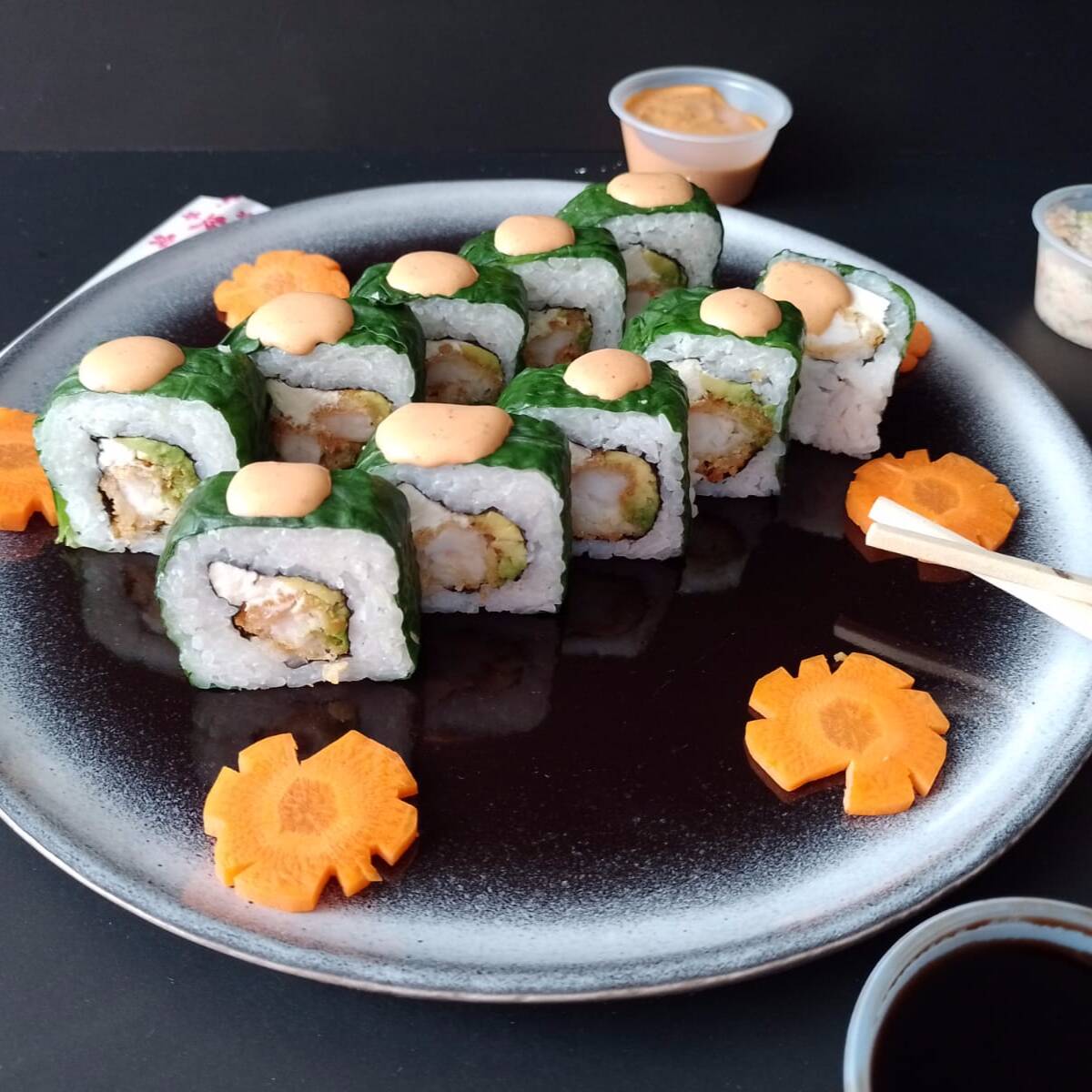 Roll cubierto de salmón sobre pasta de cangrejo, relleno de queso crema, surimi y aguacate, acompañado de salsa dulce y salsa chipotle