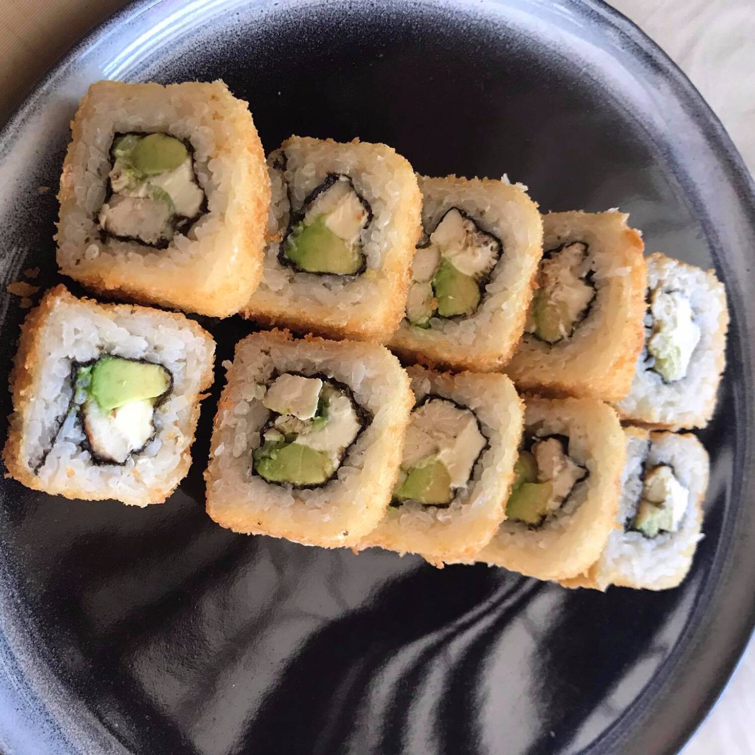 Roll empanizado relleno de pollo, aguacate y queso crema, sobre cama de kakiague, acompañado de salsas dulce y chipotle