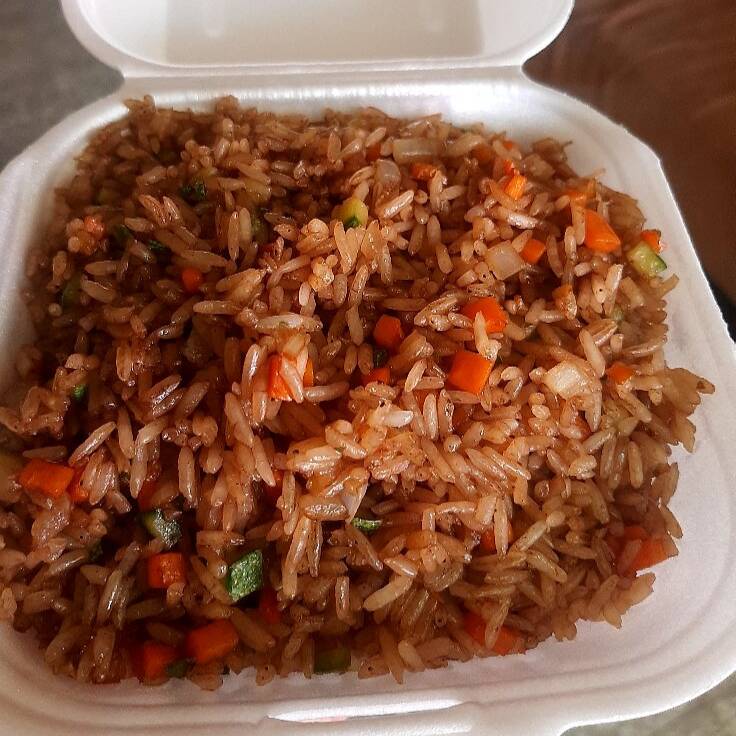 Arroz frito, elote, calabaza, cebolla, zanahoria, ajo frito, cebollín, kakiague y pollo, acompañado de salsa chipotle y chiles toreados
