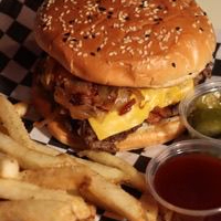 Doble Carne Res 100g, Doble Queso, Mermelada tocino, Aderezo de la casa. Servida en Pan brioche y Papas a la francesa.