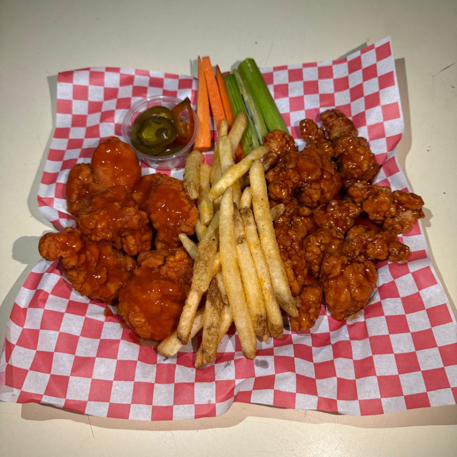 500gr de Pollo, Apio, Zanahoria, Aderezo Ranch o blue cheese, Papas a la Francesa, 2 Salsas de tu elección.