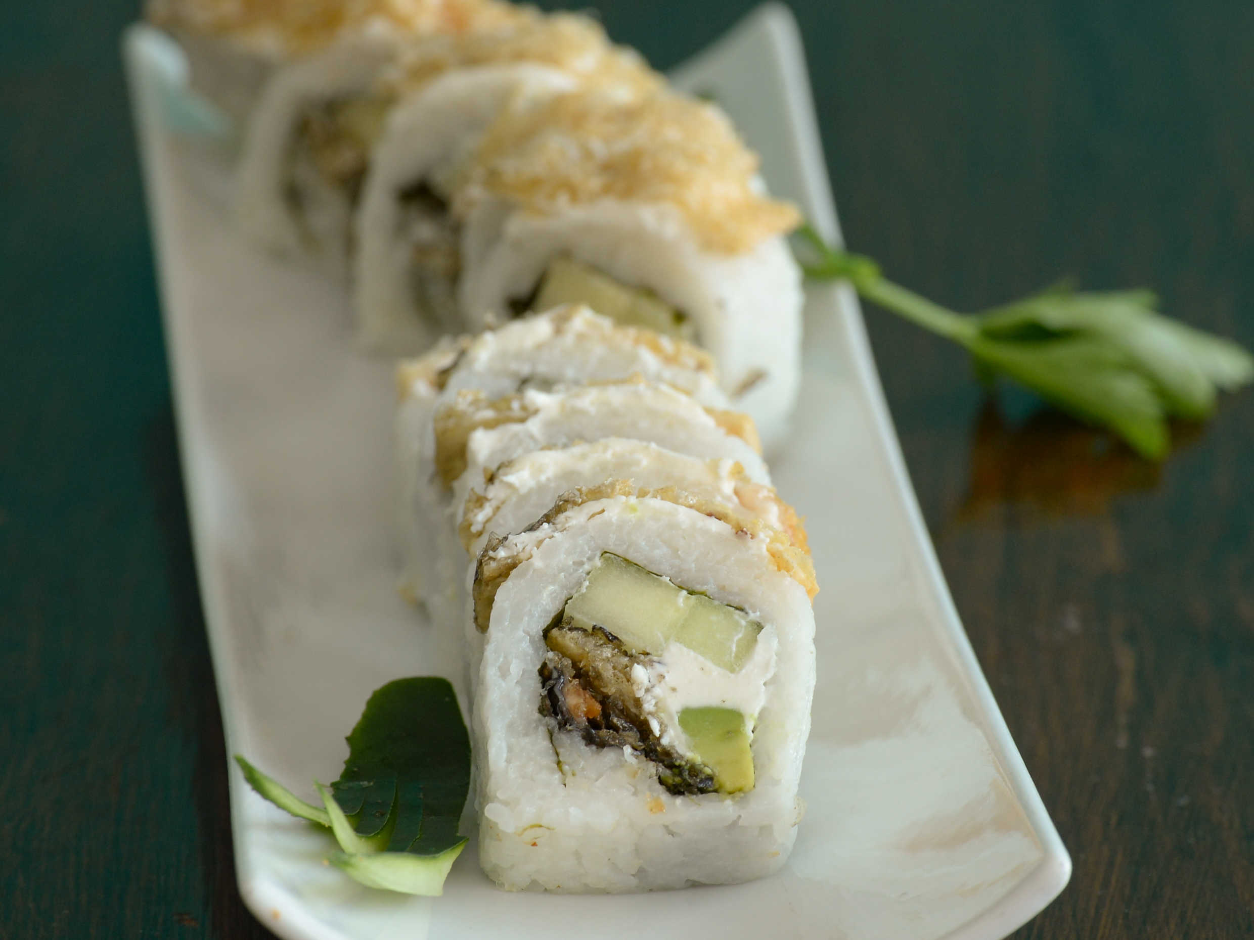 Camarón, anguila, tampico y aguacate.