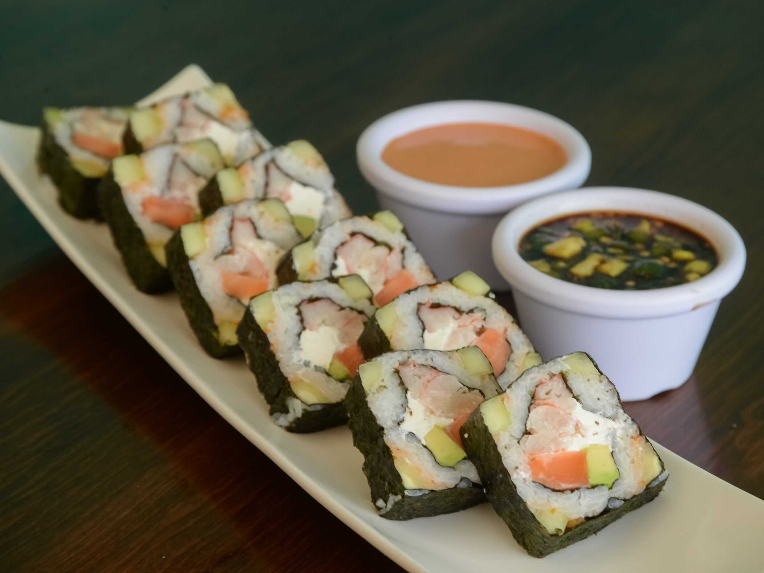 Camarón, cangrejo, salmón, masago, queso philadelphia, pepino y aguacate. Por fuera nori.