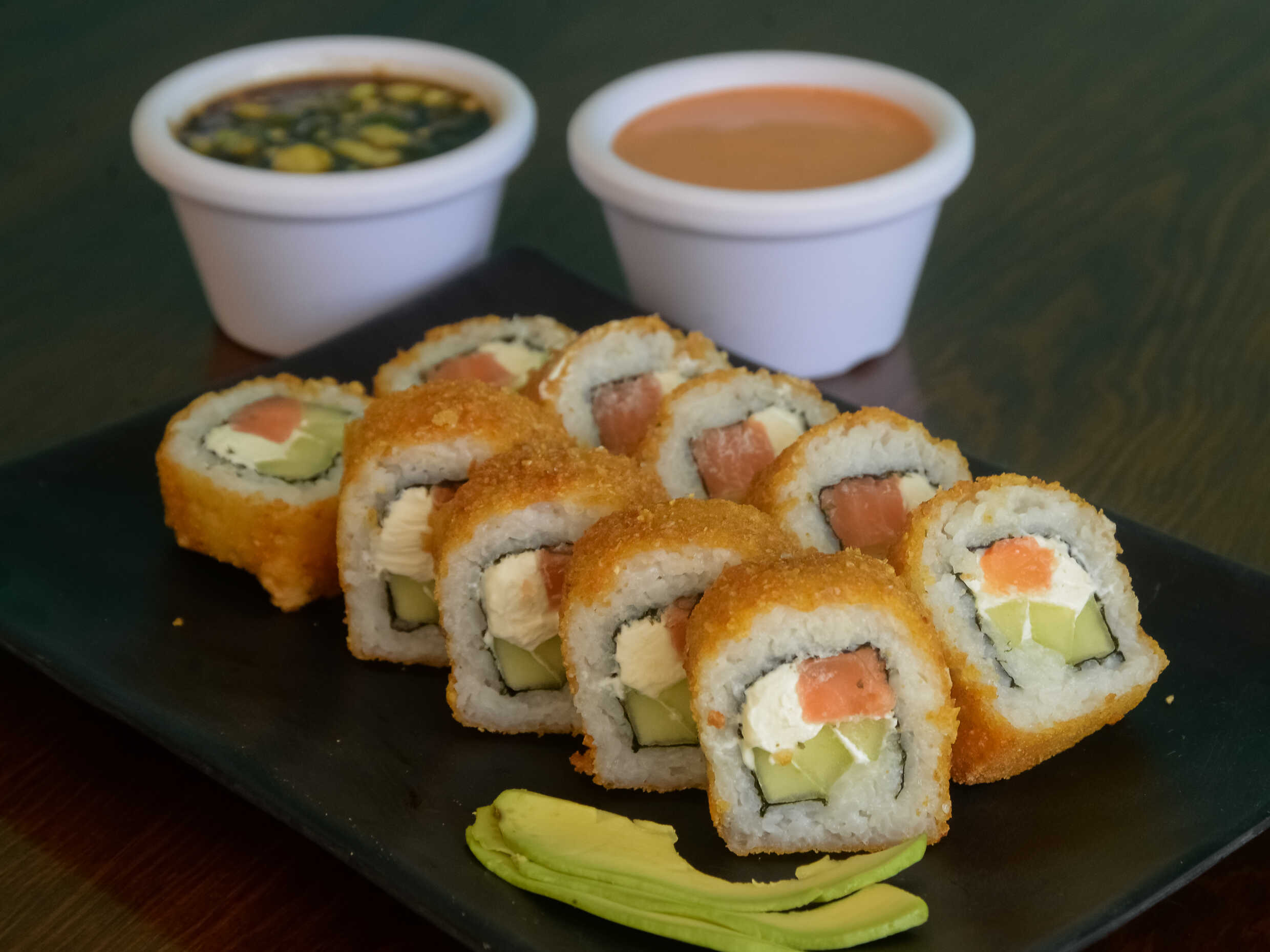 Chicharrón de salmón, queso philadelphia, pepino y aguacate, por fuera queso philadelphia y chicharron de salmon.