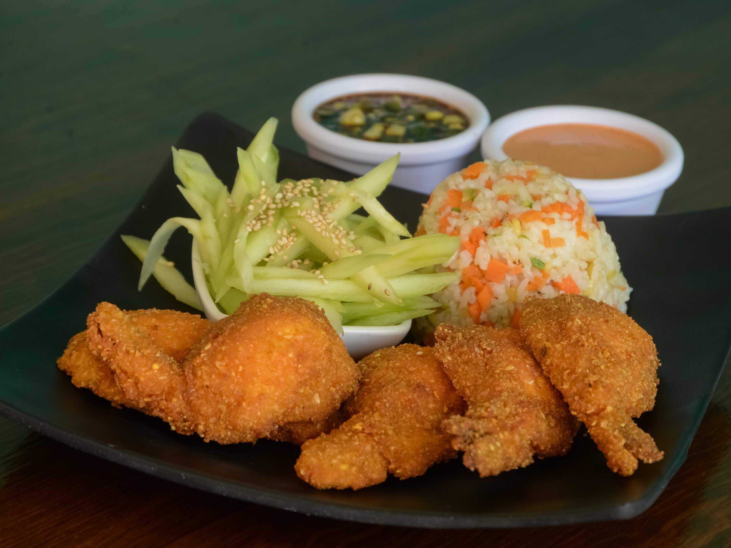 5 camarones rellenos de queso philadephia y tocino empanizados, Acompanados de arroz y pepino