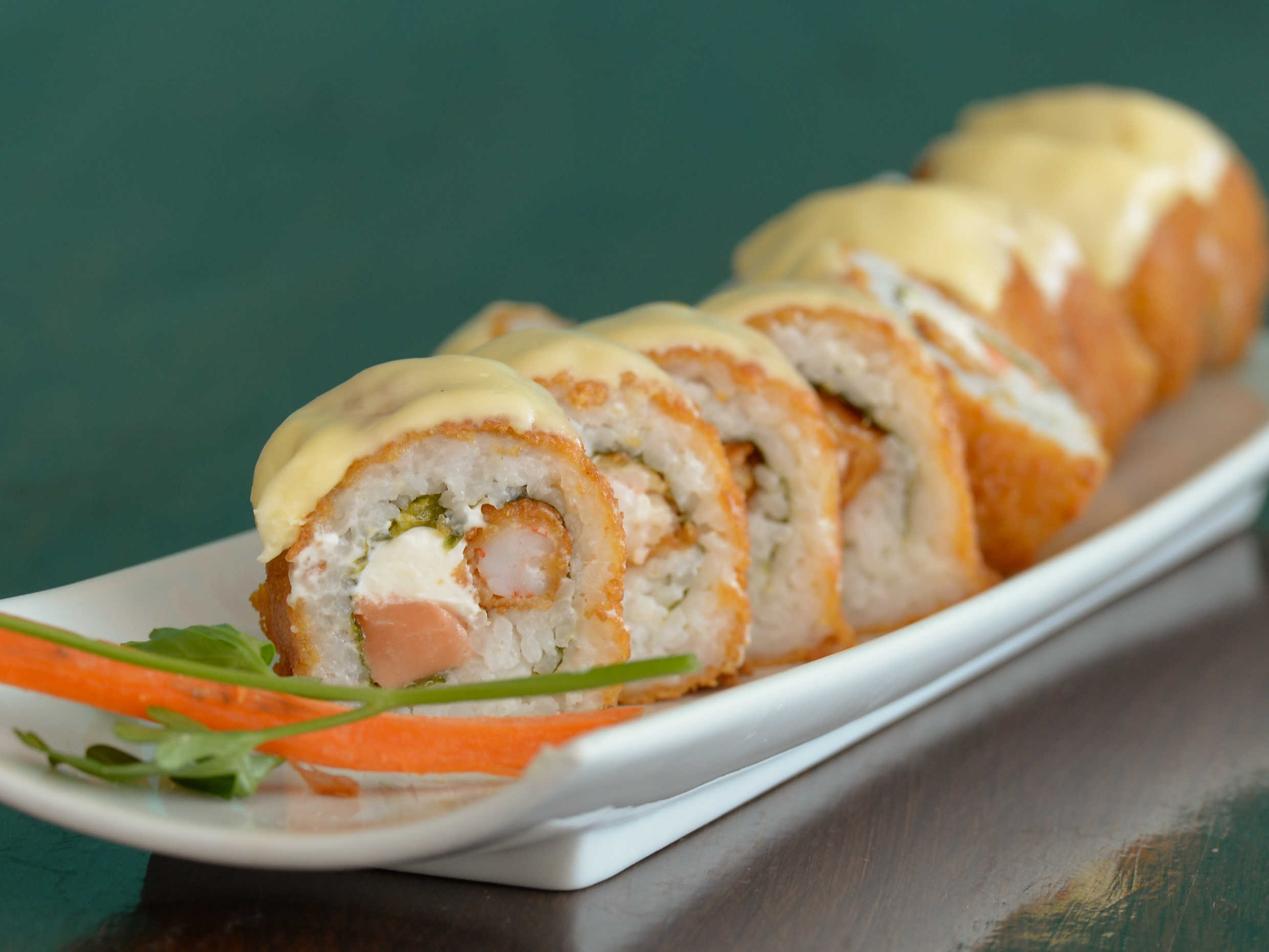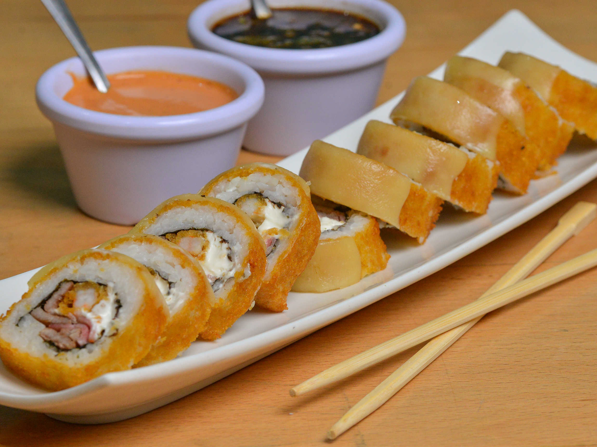 Camarón empanizado, salmón y queso philadelphia por fuera surimi y queso gratinado.