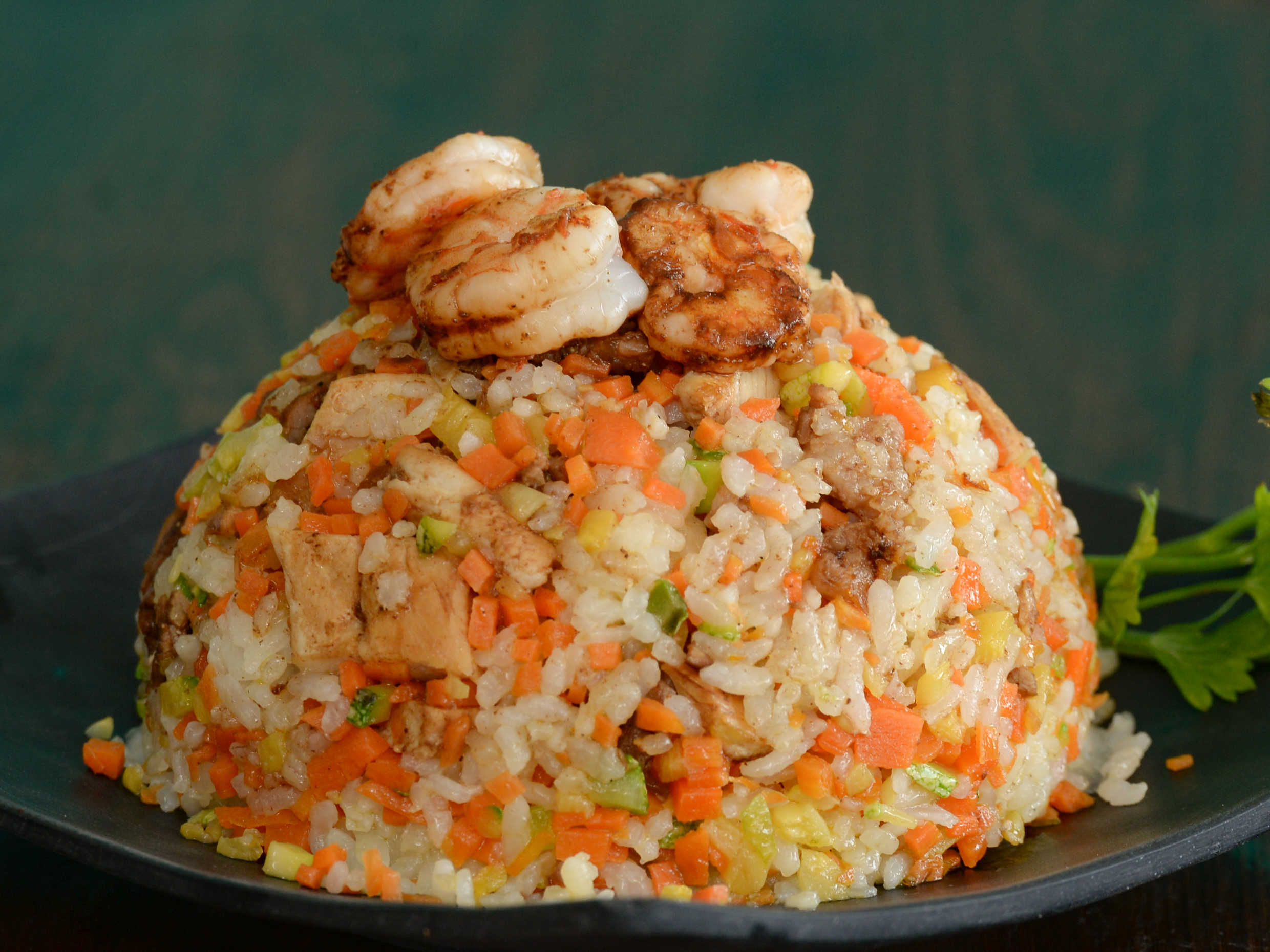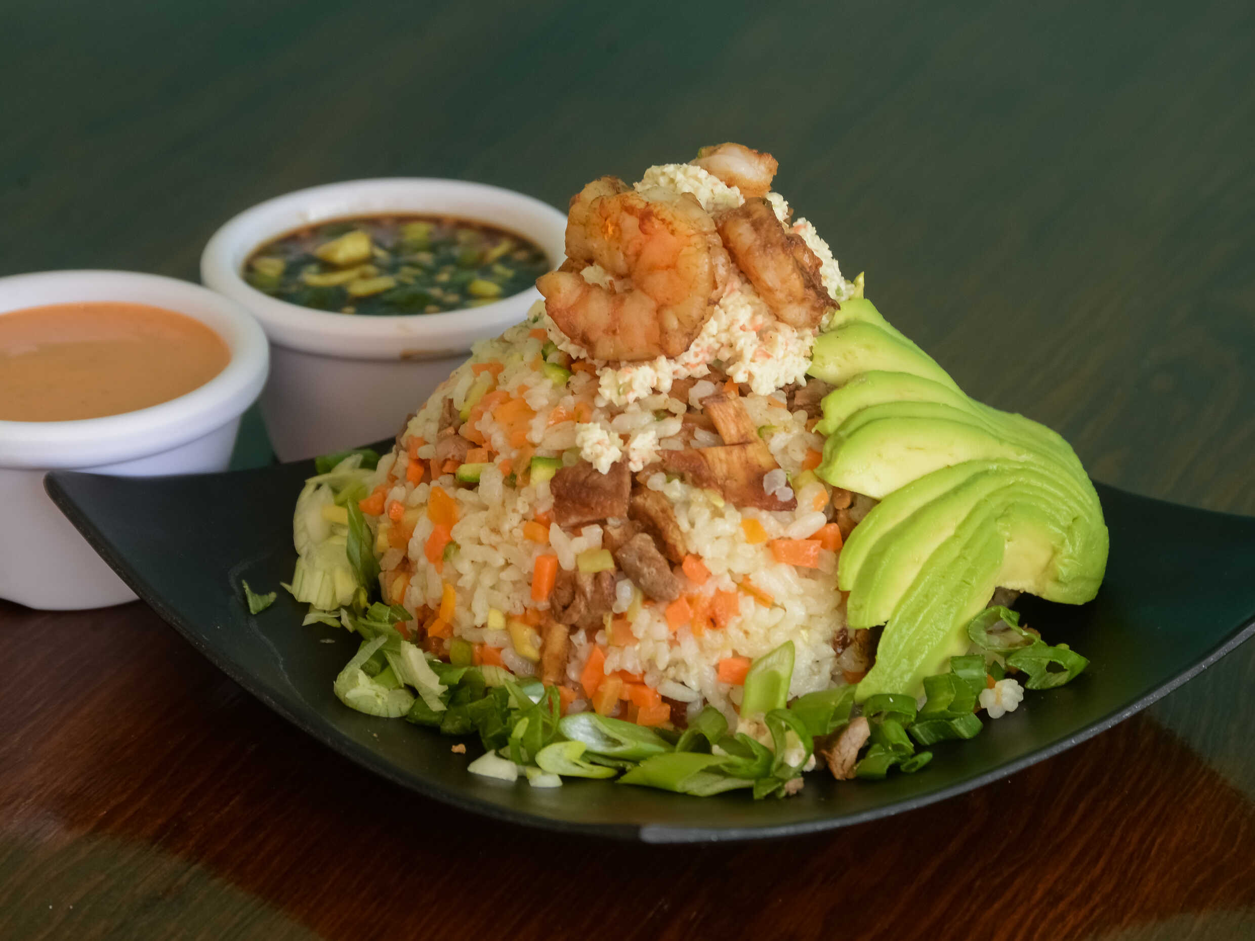 Arroz frito con zanahoria, calabaza, cebollín, champiñones, camarones, sirloin, pollo, tampico y aguacate.