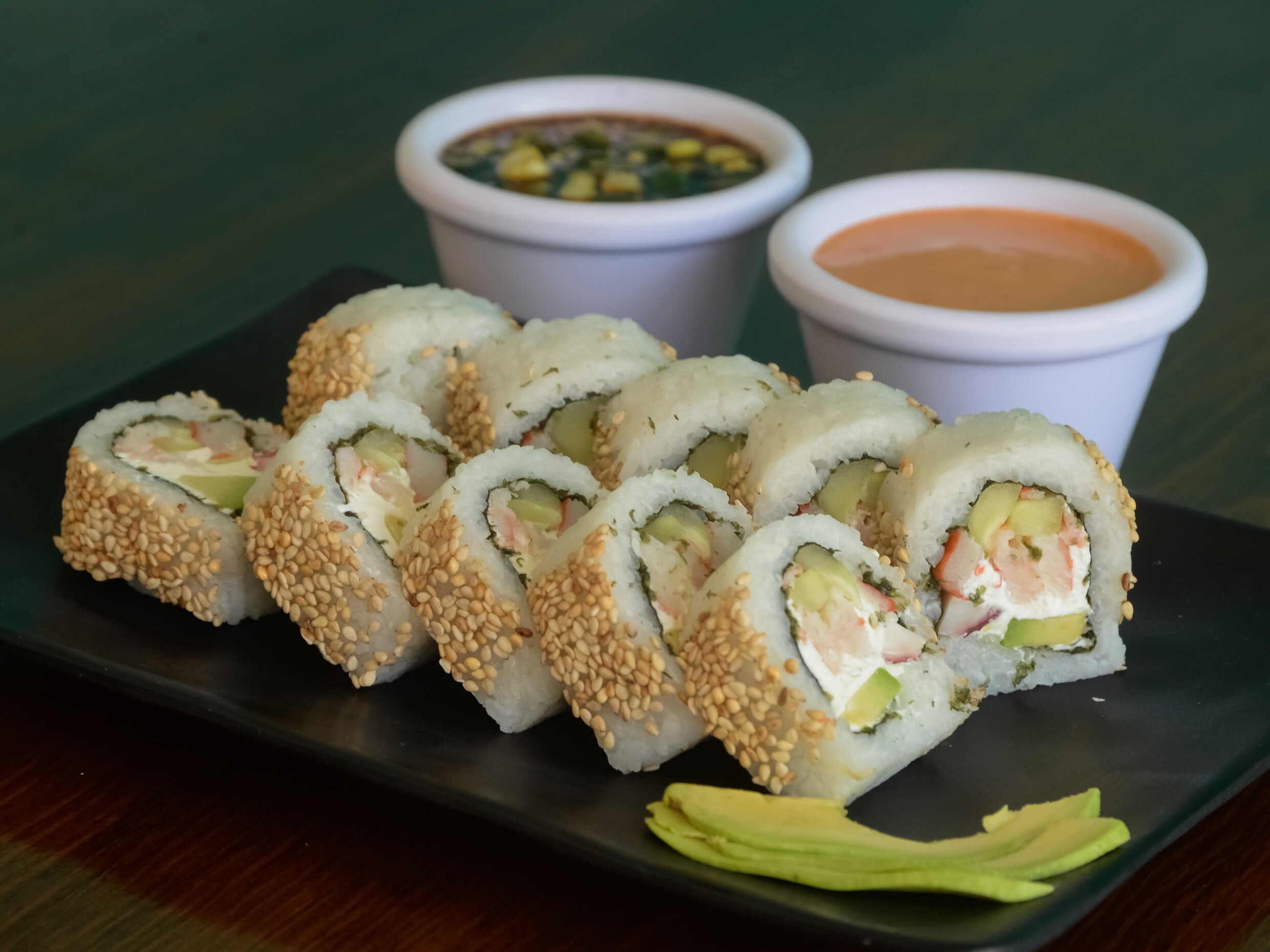 Queso philadelphia, pepino y aguacate, por fuera ajonjolí.