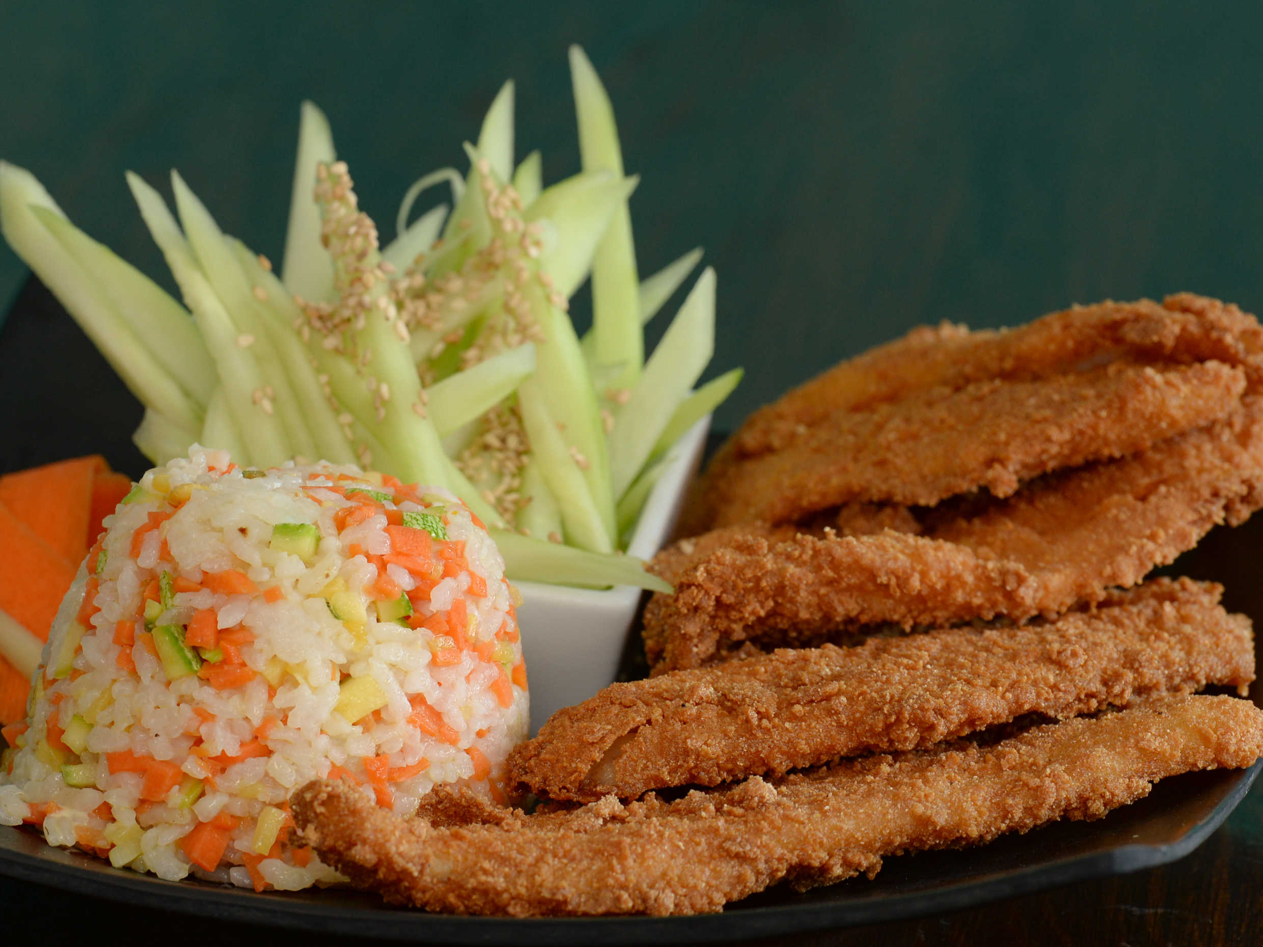 4 piezas de pescado empanizado. Acompanado de arroz y pepino.