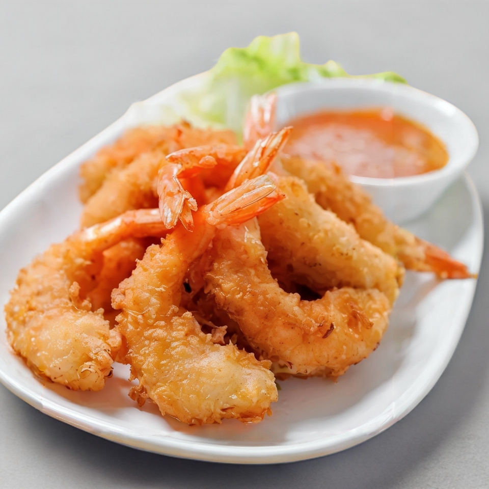 4 Camarones jumbo empanizado en coco/ empanizado clásico, pepino y aderezo