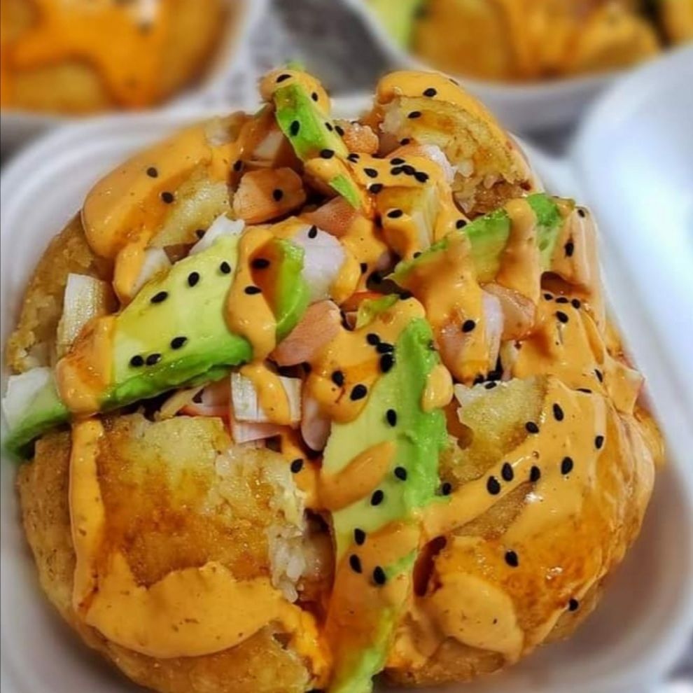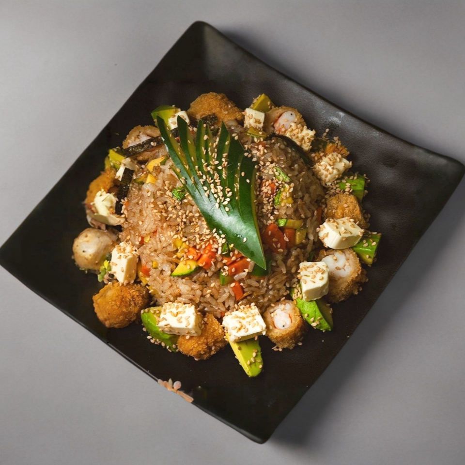 Surimi empanizado, aguacate, queso, toreados, pepino y ajonjolí