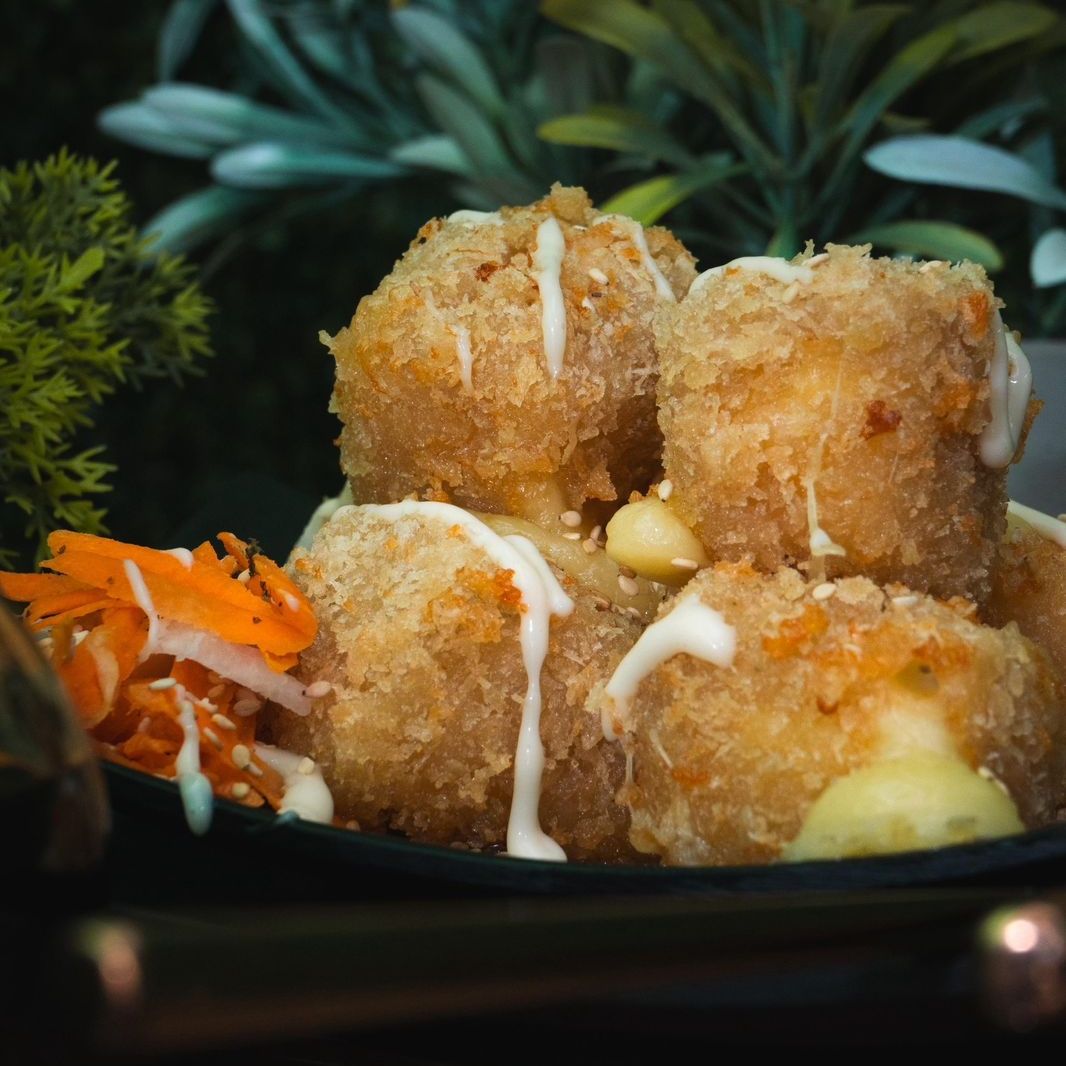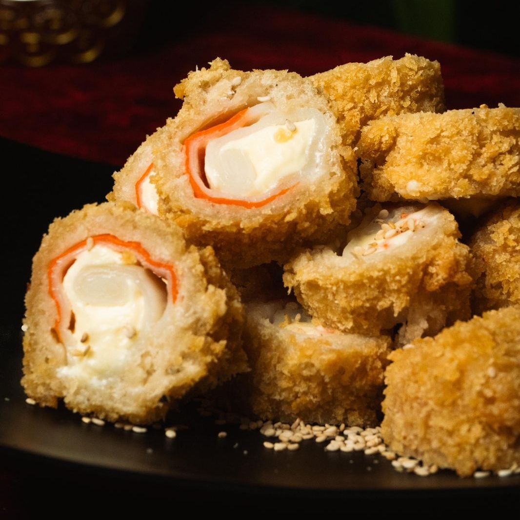 Rollos de surimi empanizados rellenos de queso crema, ajonjolí y aderezo
