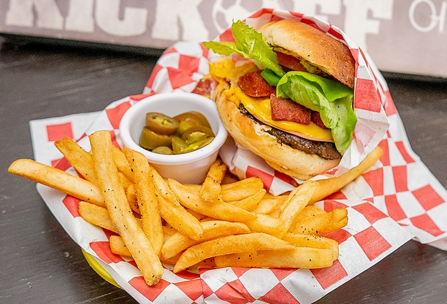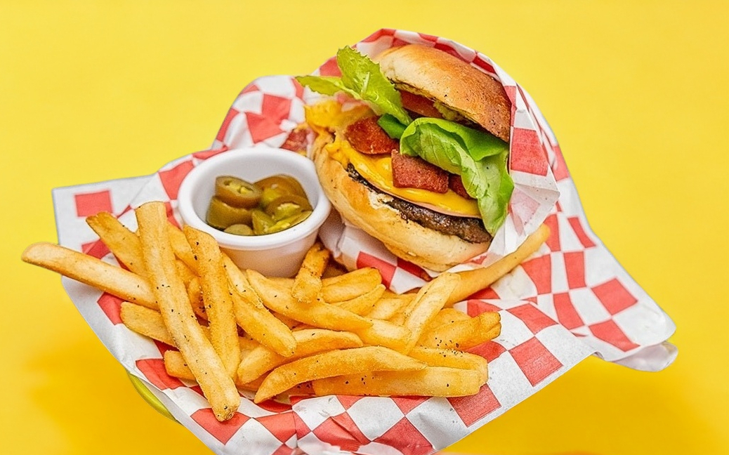 Carne de la casa, queso amarillo, lechuga, tomate, cebolla morada y chiles jalapeños. Acompañada con papas a la francesa.