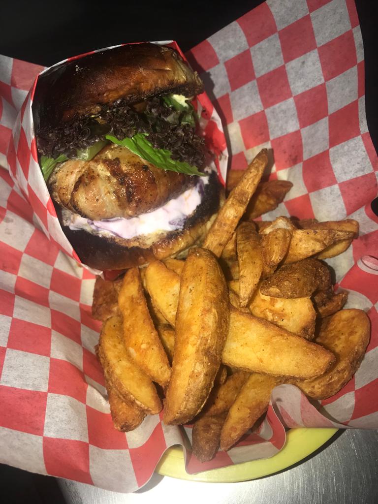 Carne de la casa rellena de jamón y queso lechuga tomate champiñones tocino aros de cebolla bañados en salsa BBQ acompañada de papas a la francesa.