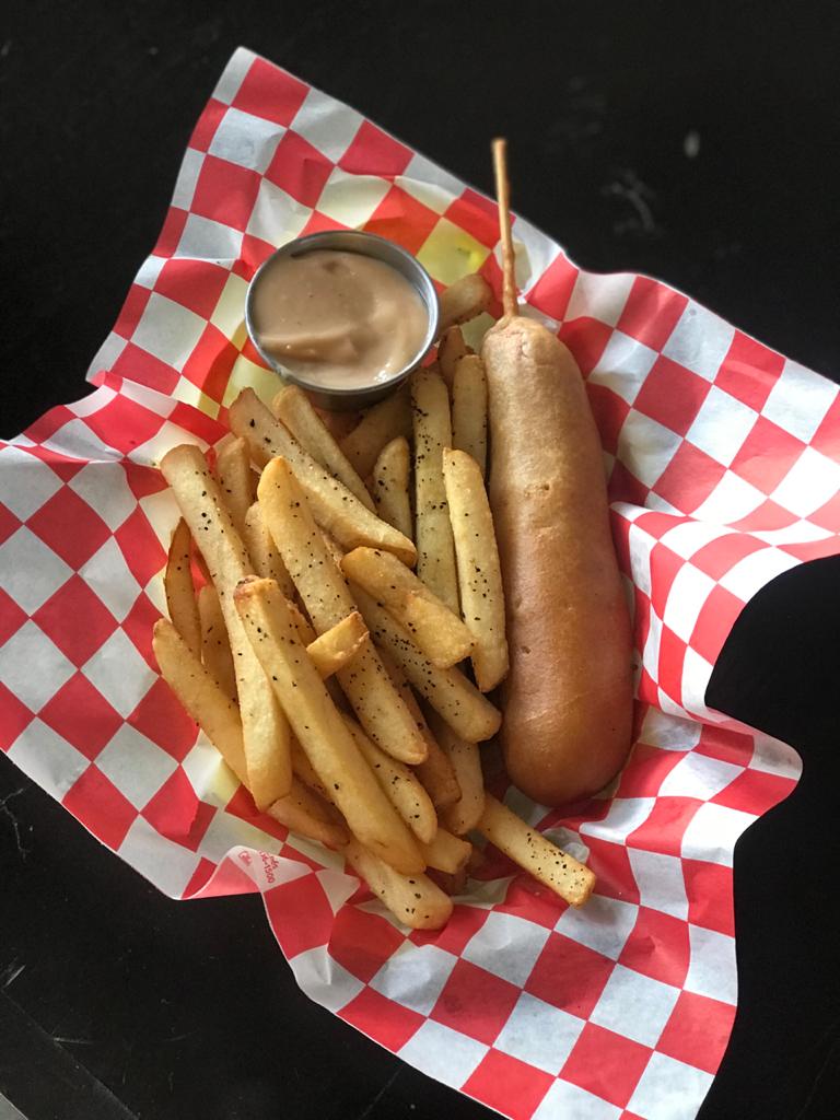 Salchicha polaca con tocino, pico de gallo, aderezo y pimiento acompañado de papas ala francesa.