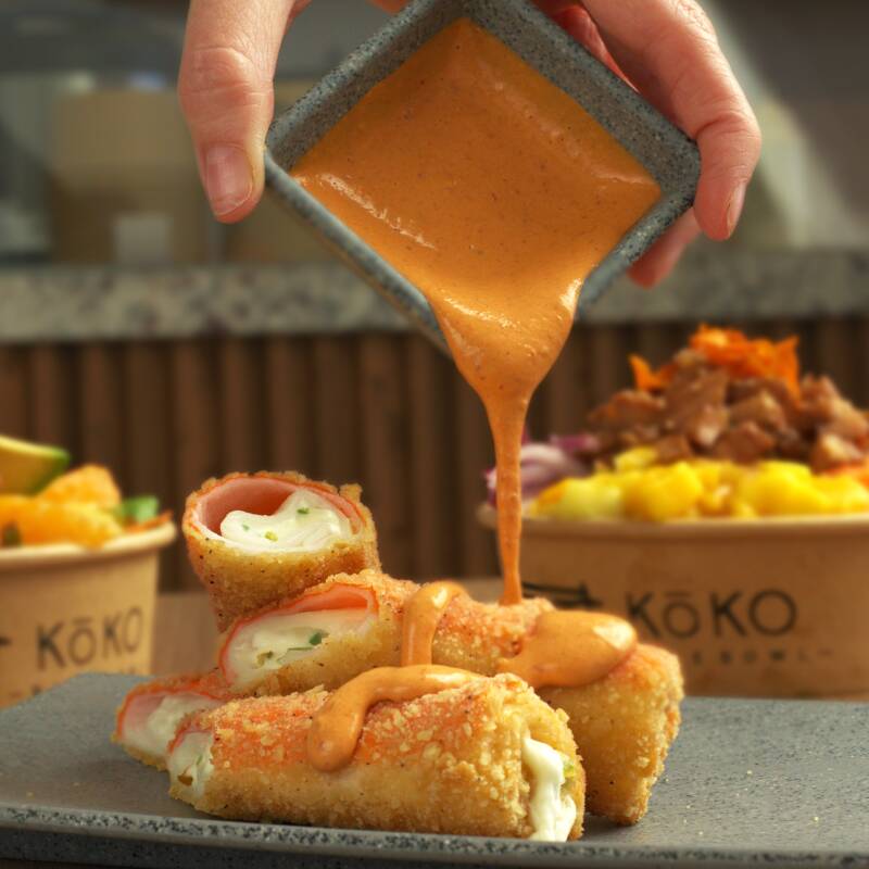 Surimi empanizado relleno de queso crema y un toque de chile serrano, acompañado de aderezo de chipotle.