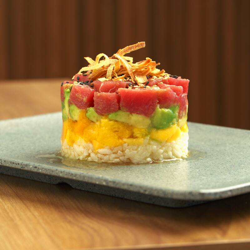 Combinación fresca de atún, mango, aguacate y arroz en capas, decorado con poro frito, ajonjolí mixto y bañado con salsa ponzu.