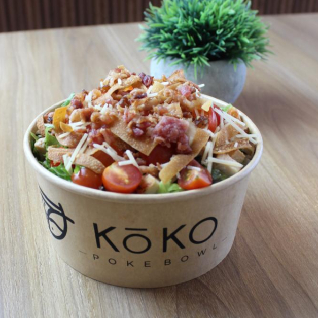 Mix de lechuga, pollo a la plancha, aguacate, tocino frito, tomate cherry, tiras de wonton, queso parmesano y aderezo de cilantro.