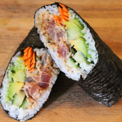 Se prepara típicamente enrollando ingredientes de sushi , como pescado y verduras, en un wrap y sirviéndolo como un burrito . Elige una proteína, 3 toppings, 2 complementos y 1 aderezo.