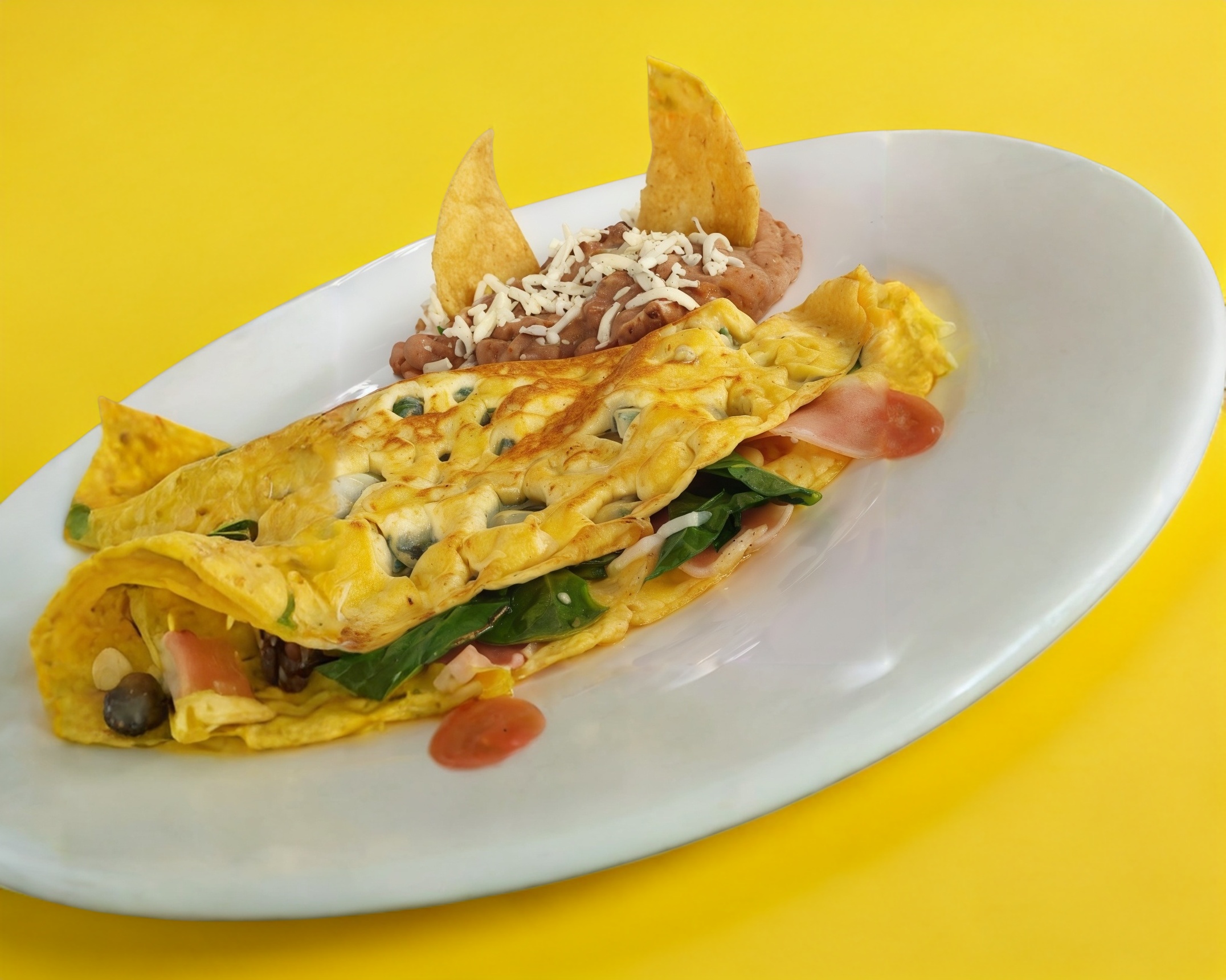 Omelet ,espinacas, jamón y queso, acompañado con frijol.