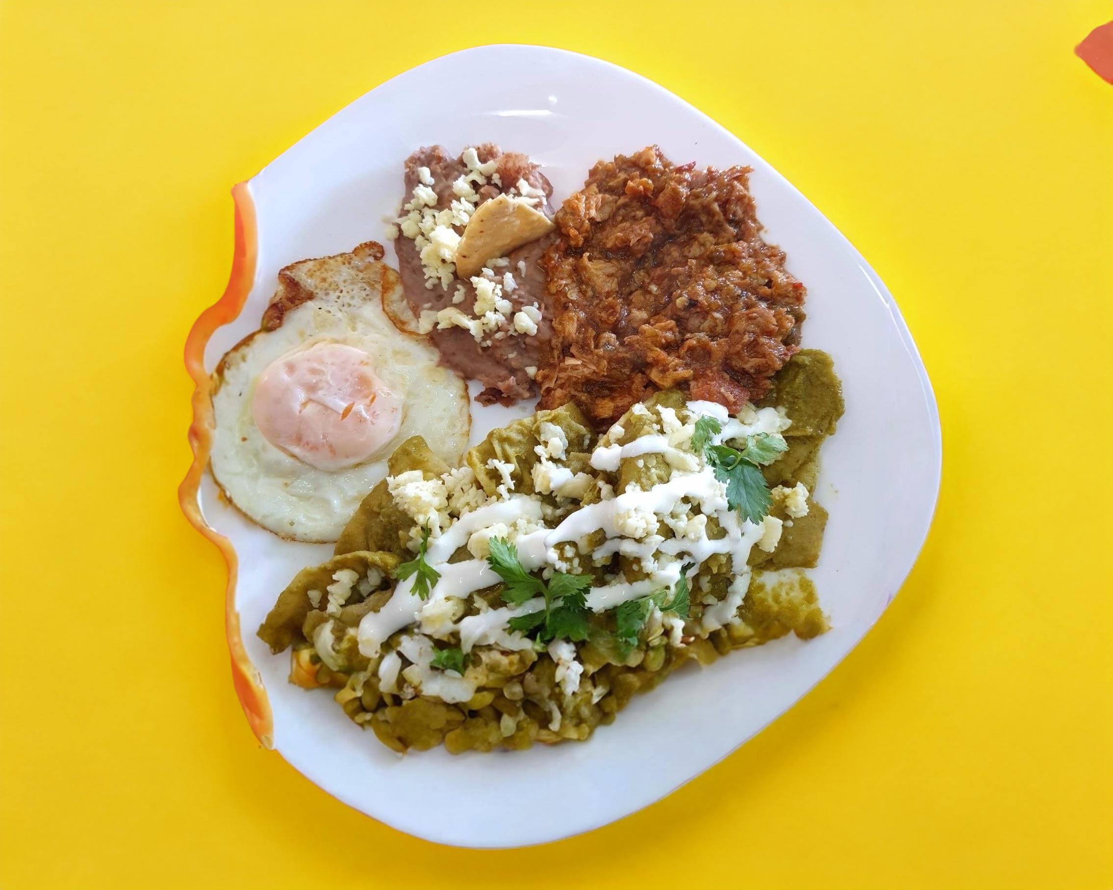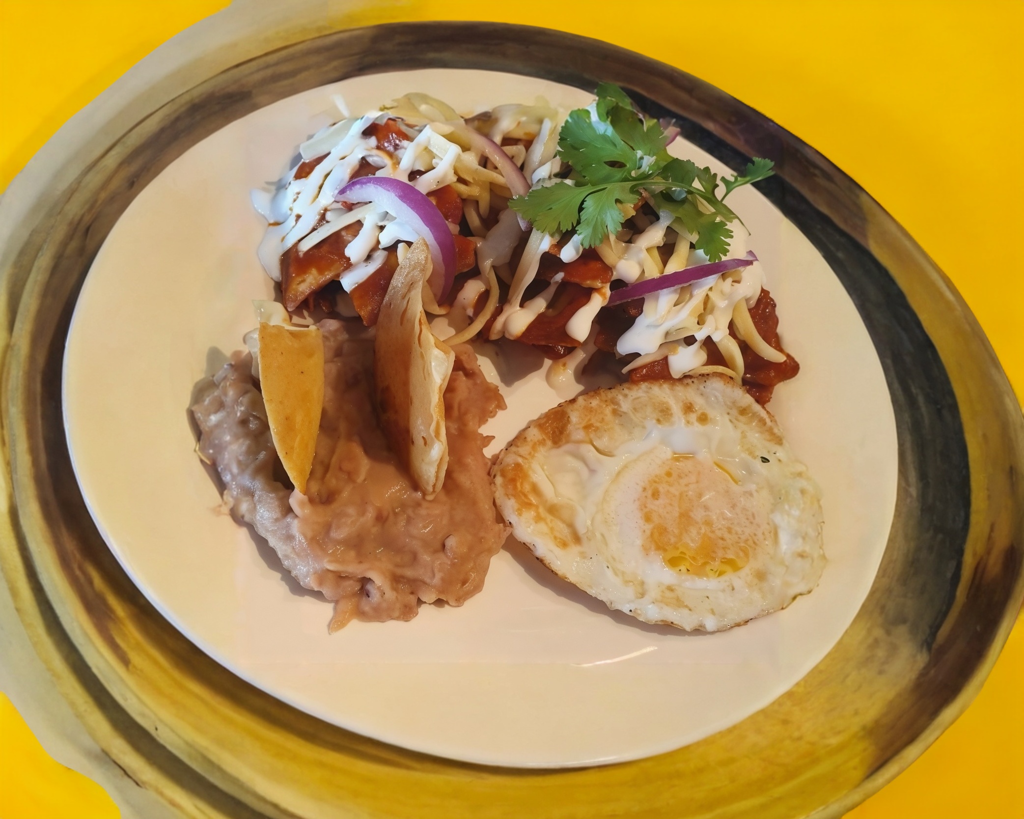 Chilaquiles rojos (chile ancho, chocolate, mirasol, ajo), huevo estrellado y frijoles refritos.