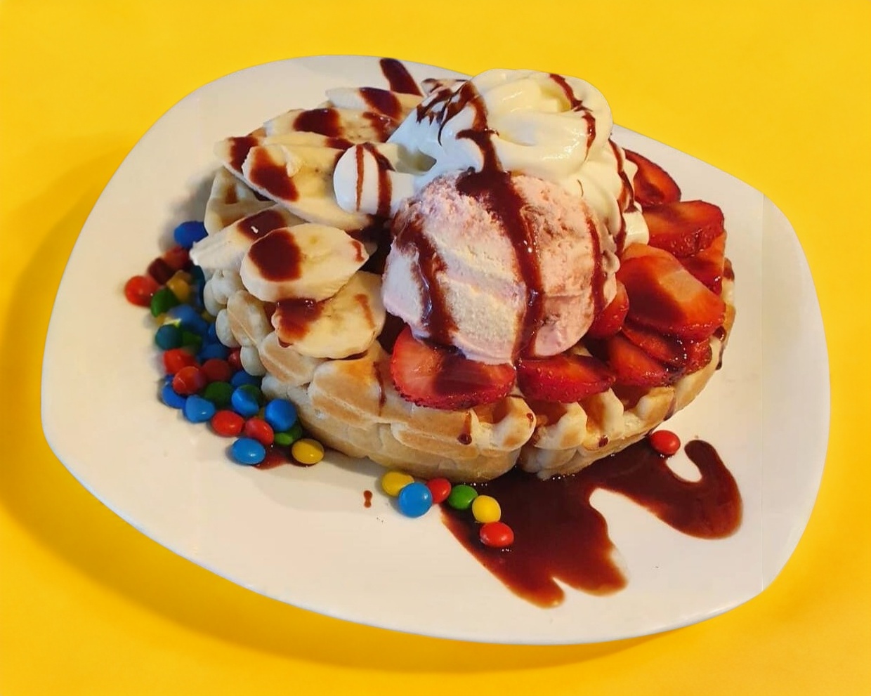 Hotcakes con fresa, plátano, crema batida, mermelada, nieve, nutella, hersheysy dulces