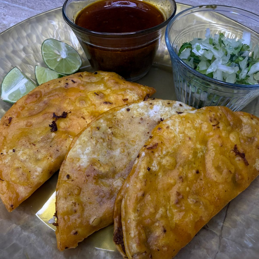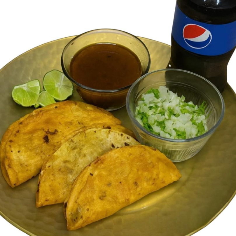 3 quesibirrias de maíz, incluye salsa, limón, verdura, consomé y refresco de 355 ml