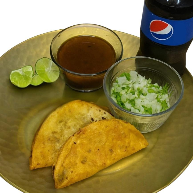 2 quesibirrias de harina, incluye consome, limon, salsa, verdura y refresco de 355 ml.