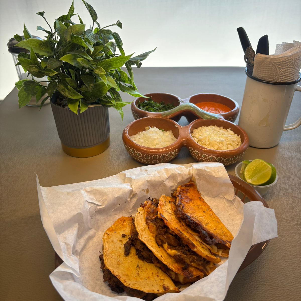 4 pzas De quesibirrias con el toque especial de la casa, birria y queso derretido en una tortilla de maíz doradita, simplemente exquisito.