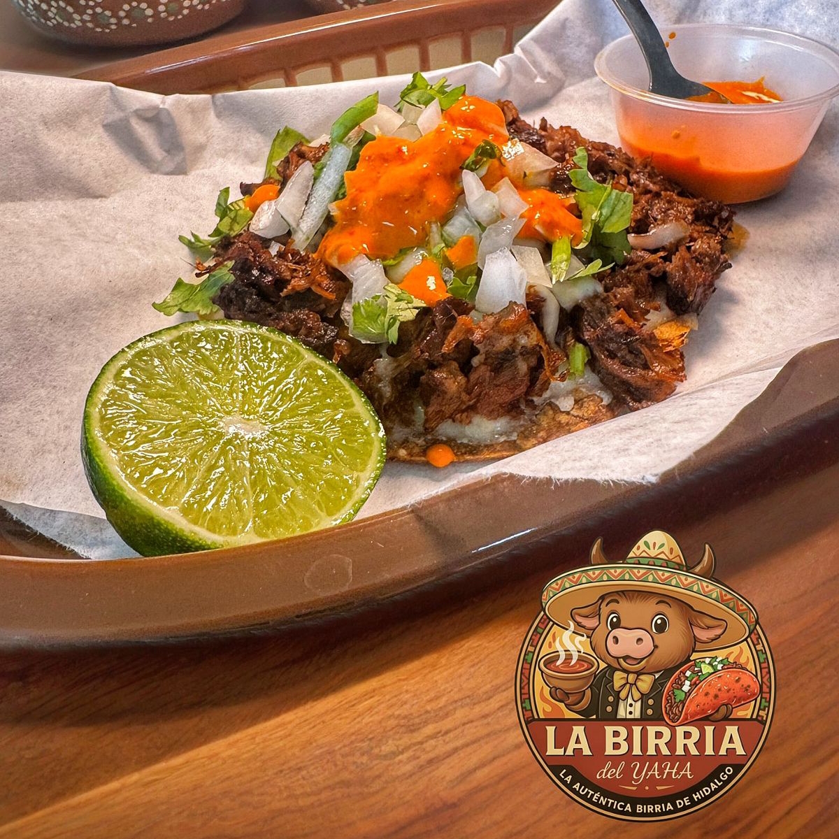 Descubre una experiencia de sabor volcánica con nuestra tortilla tostada, birria jugosa y el queso derretido, ideal para los amantes de la birria.