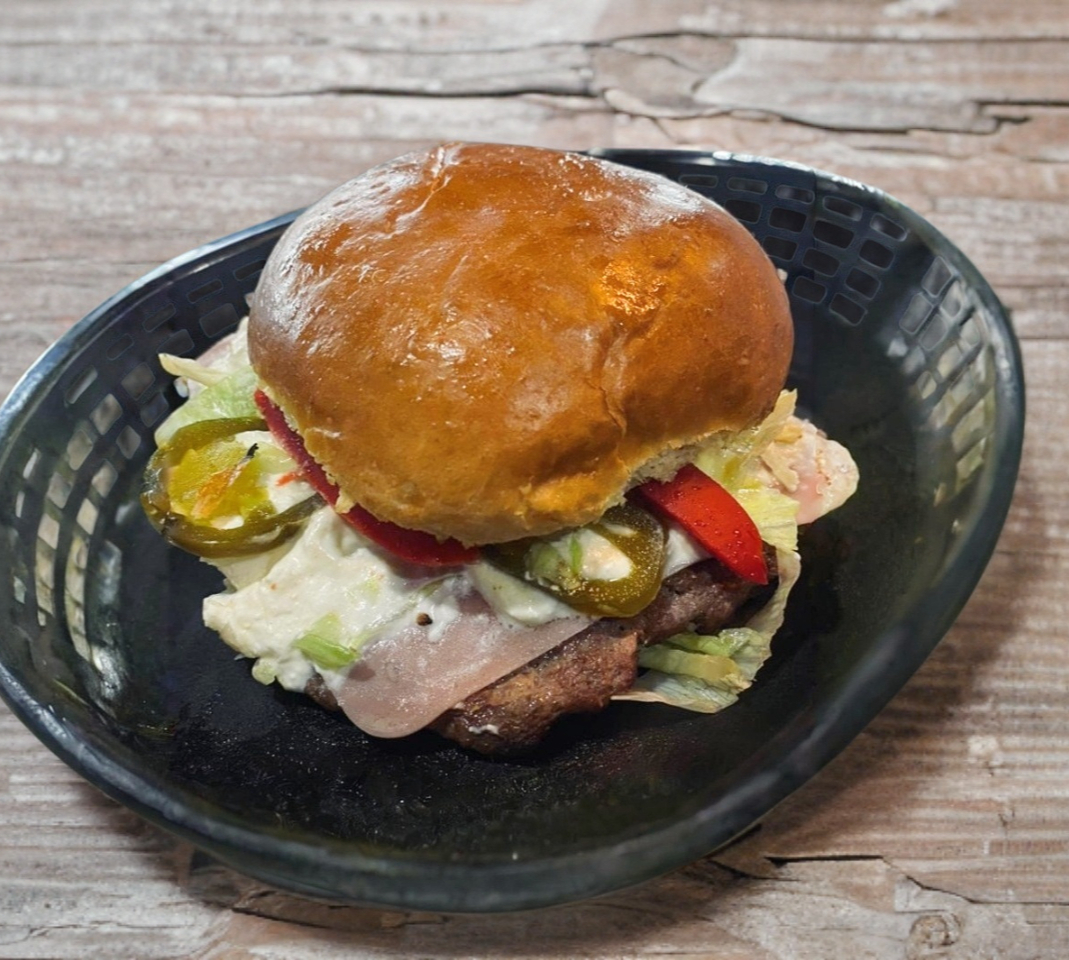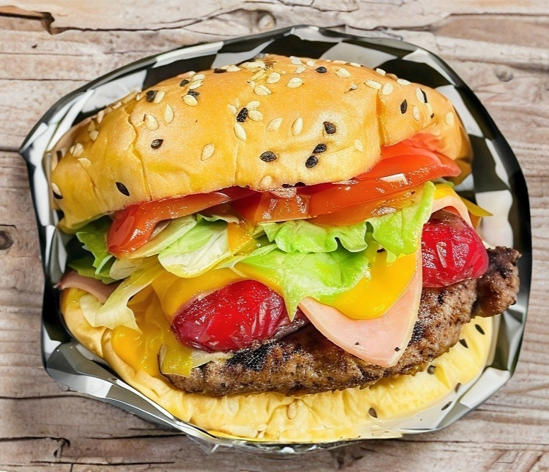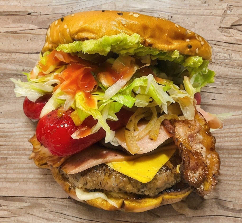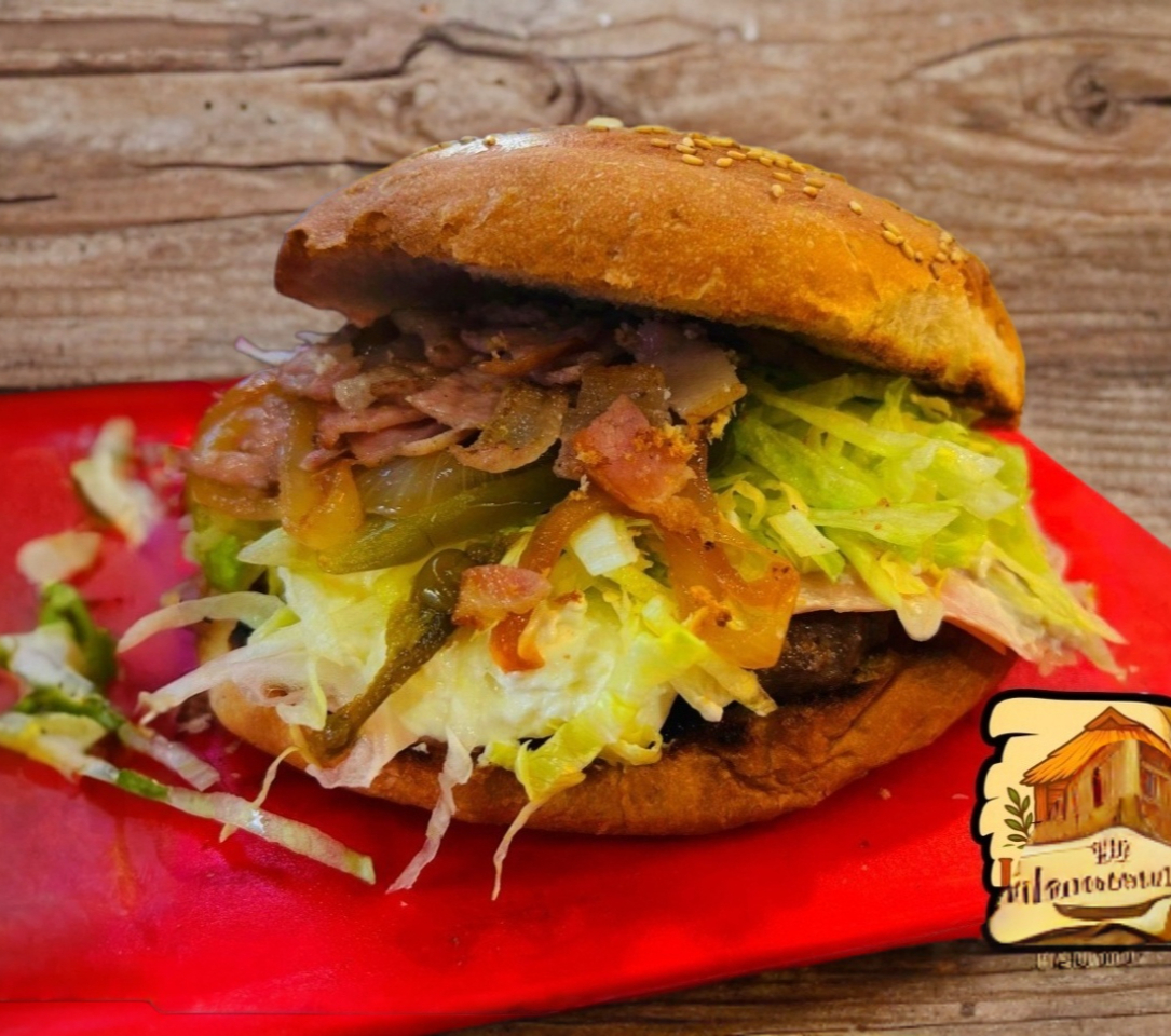150g de carne, jamón, chile jalapeño, verdura, tocino y queso philadelphia.