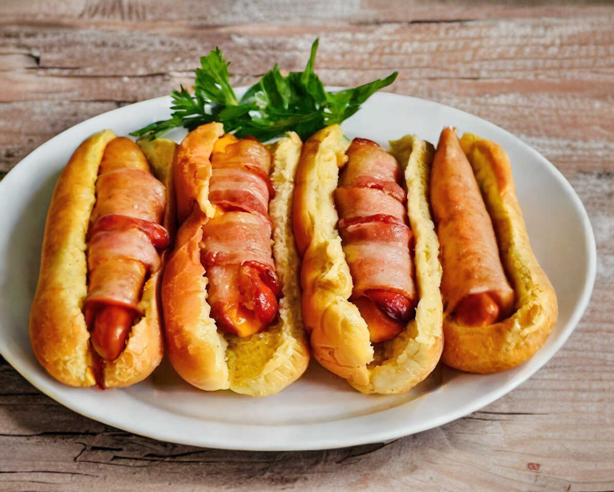 1 salchicha de asar con queso chihuahua y tocino, acompañado de 2 tortillas de maíz y salsas.