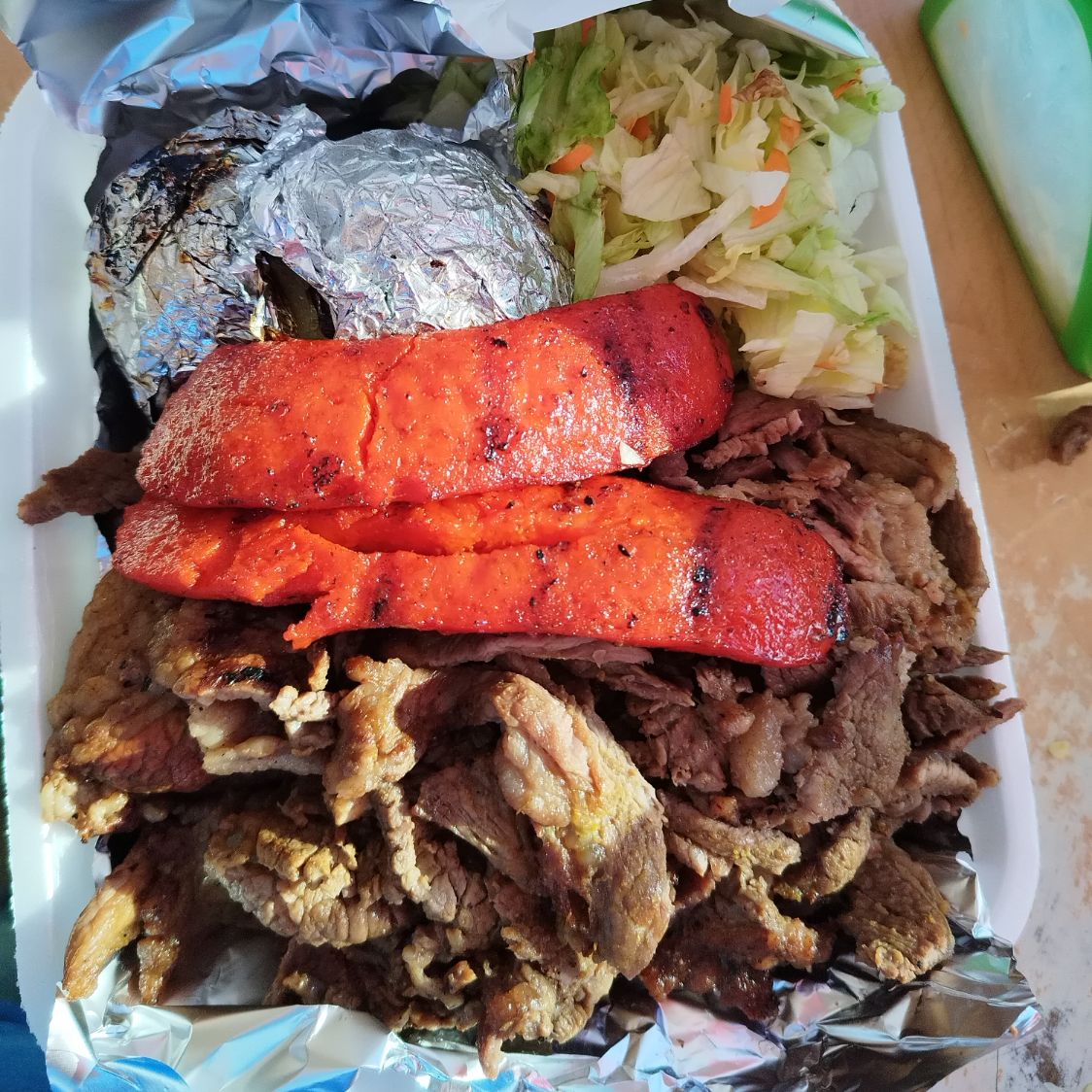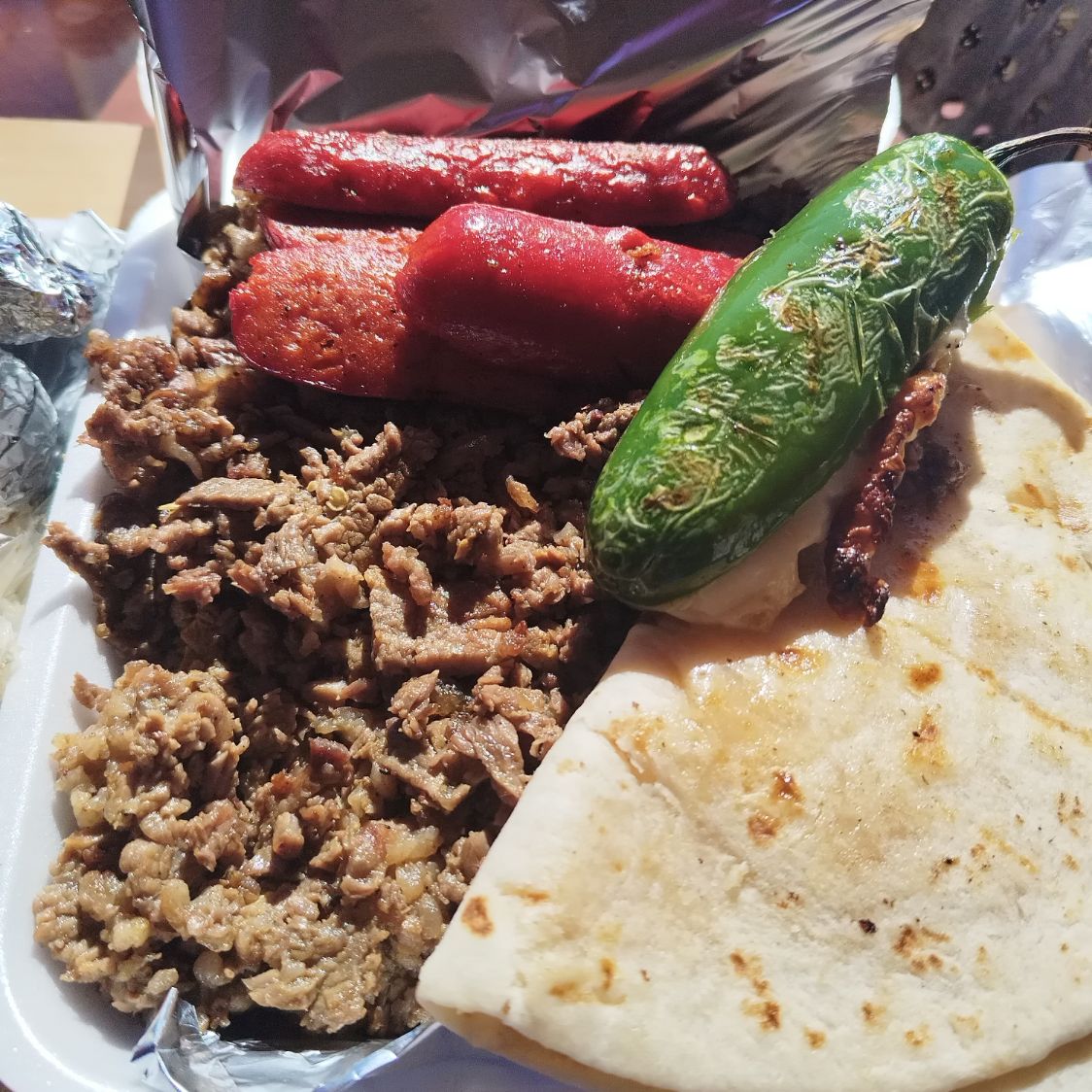750g de Carne Asada (peso en crudo) picada, + 1 Salchicha Asada + Quesadilla de Maiz + Chile Chilaca Asado, inlcuye verdura, salsa y tortillas.